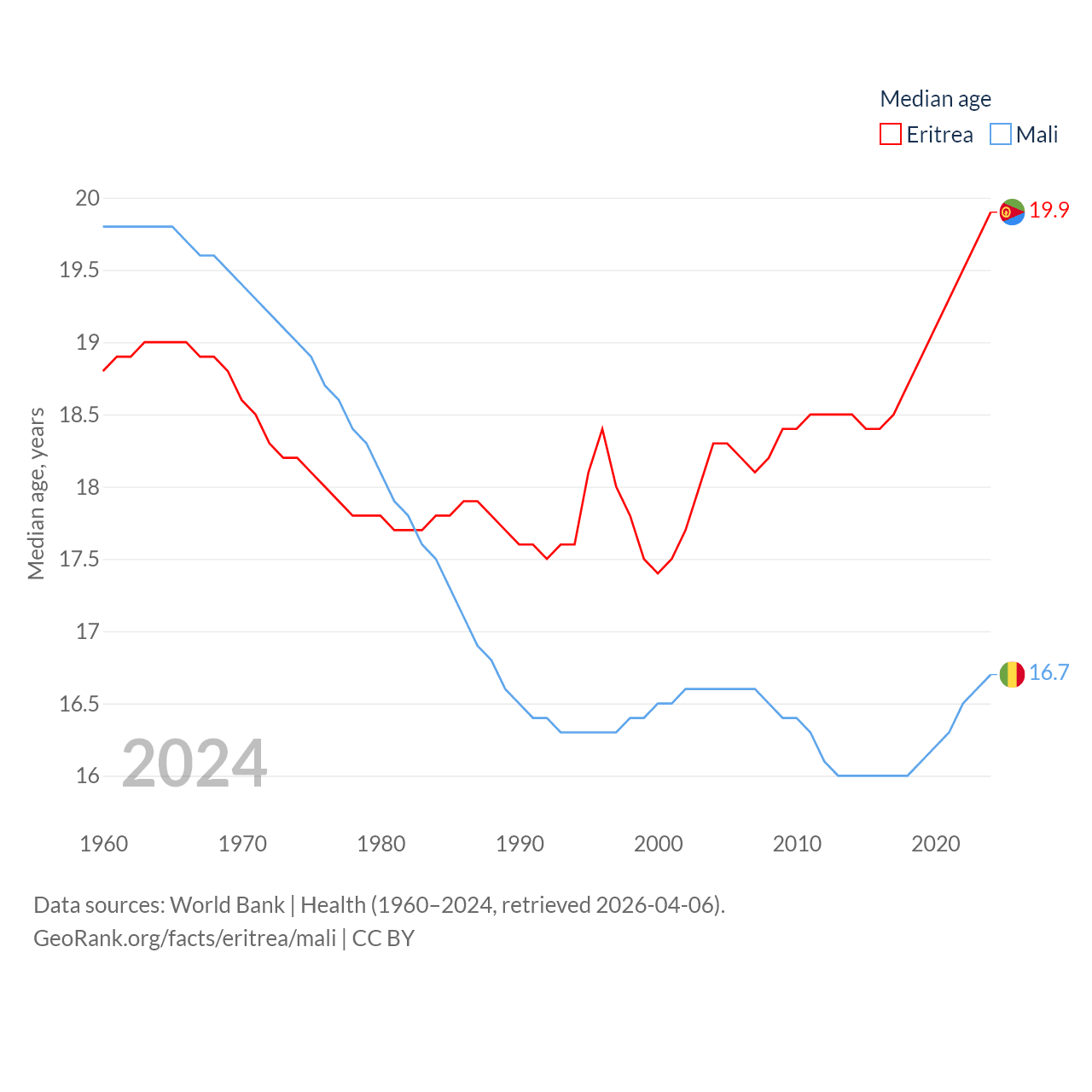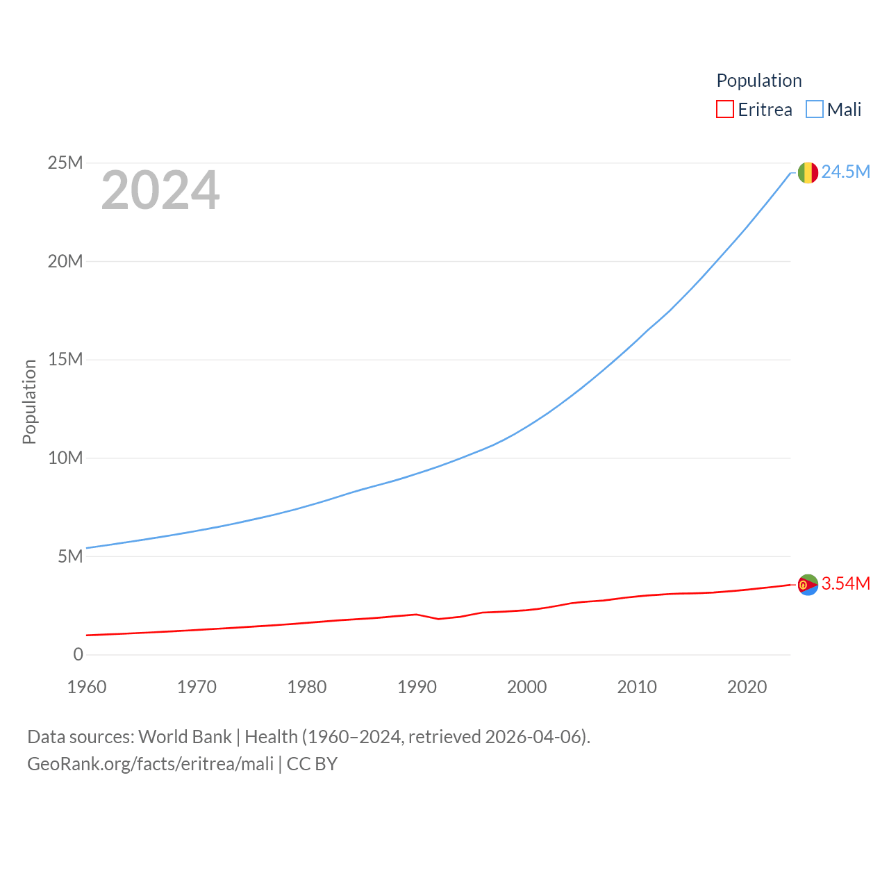 Eritrea has a population of 3.54M (ranked 131/197), compared with 24.5M in Mali (ranked 58/197). Eritrea's land area is 46,787 sq mi versus 471,118 sq mi for Mali (ranked 96th vs. 23rd).
