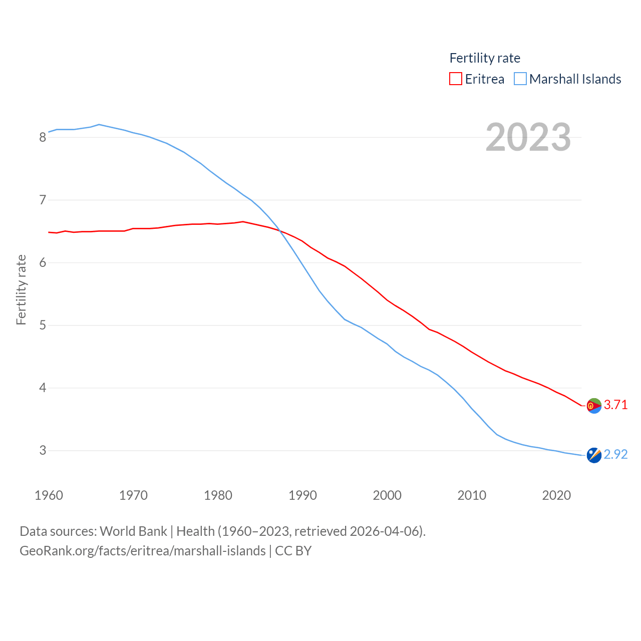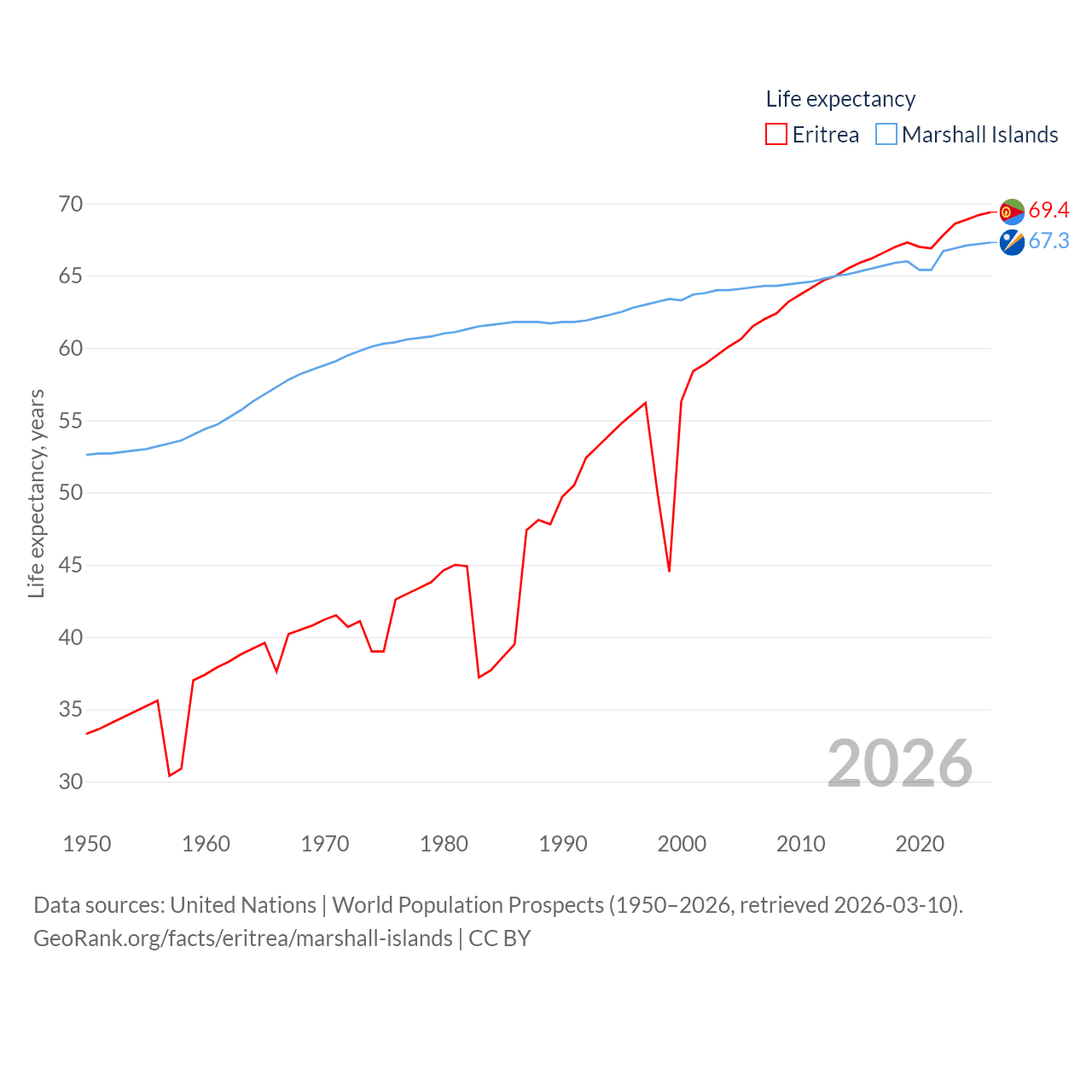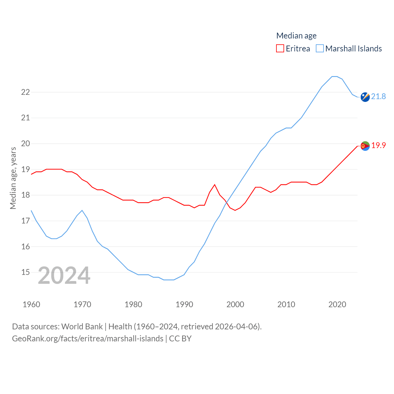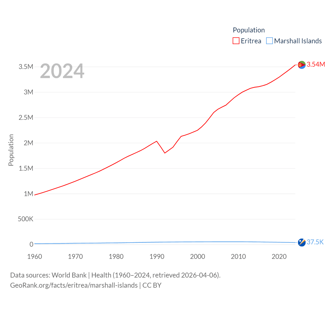 Eritrea has a population of 3.54M (ranked 131/197), compared with 37.5K in The Marshall Islands (ranked 192/197). Eritrea's land area is 46,787 sq mi versus 69.5 sq mi for The Marshall Islands (ranked 96th vs. 191st).