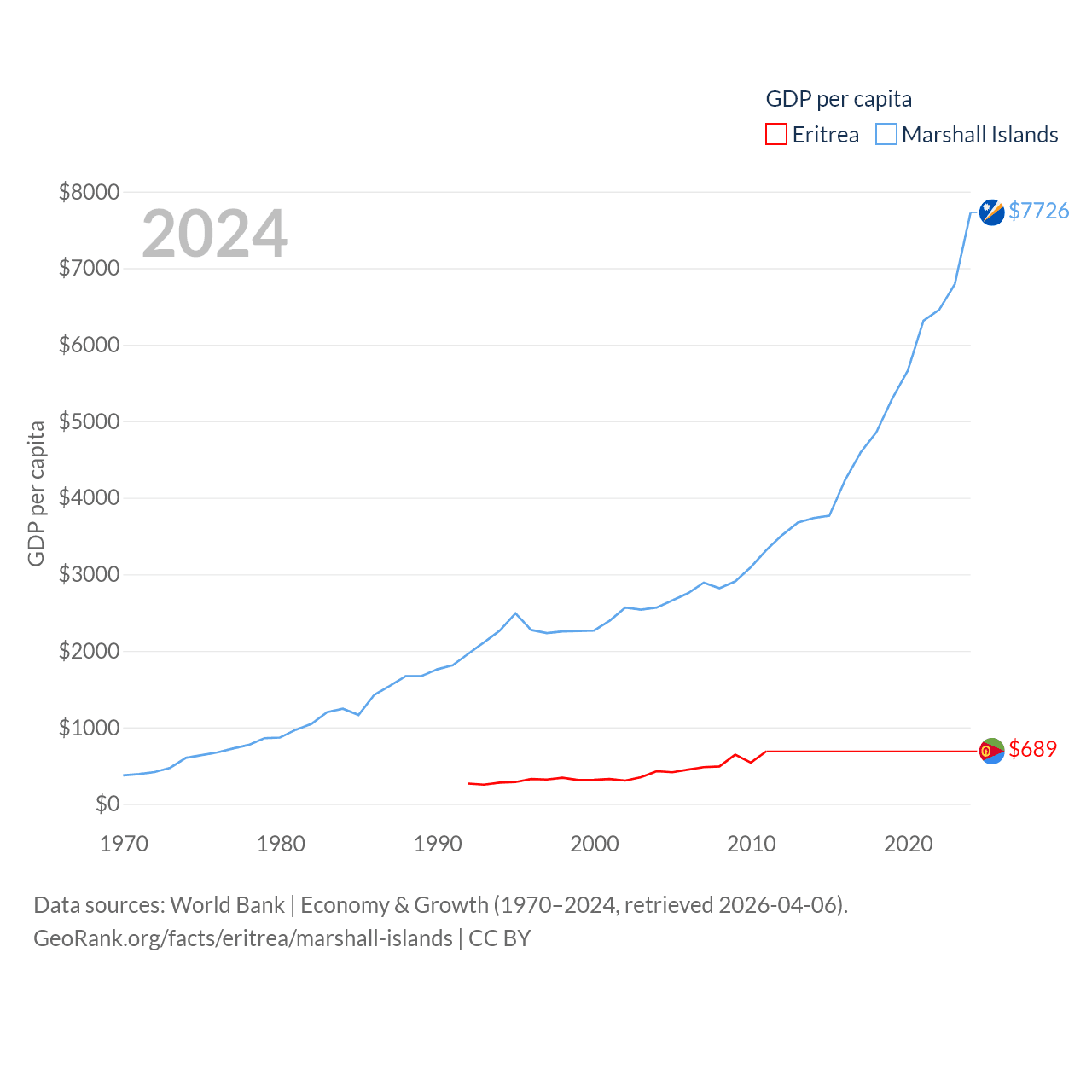 By GDP, Eritrea ranks 179/197 ($2.07B) and The Marshall Islands ranks 193/197 ($290M). By GDP per capita, Eritrea ranks 188/197 ($689), while The Marshall Islands ranks 96/197 ($7,726).