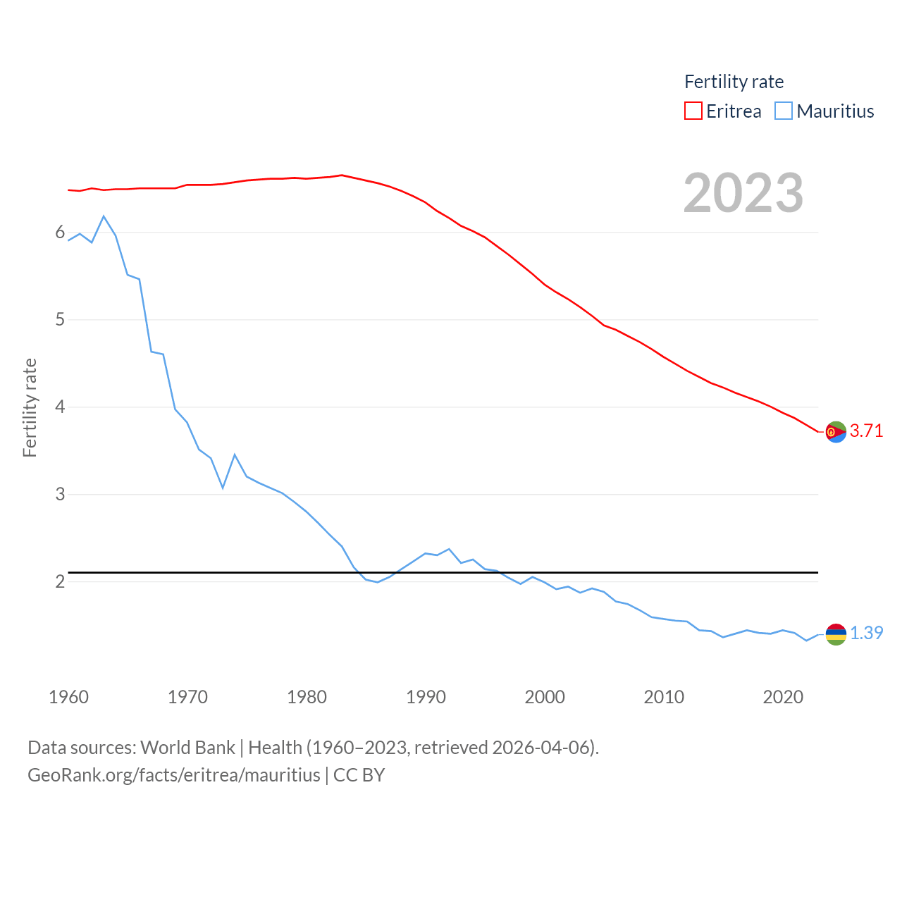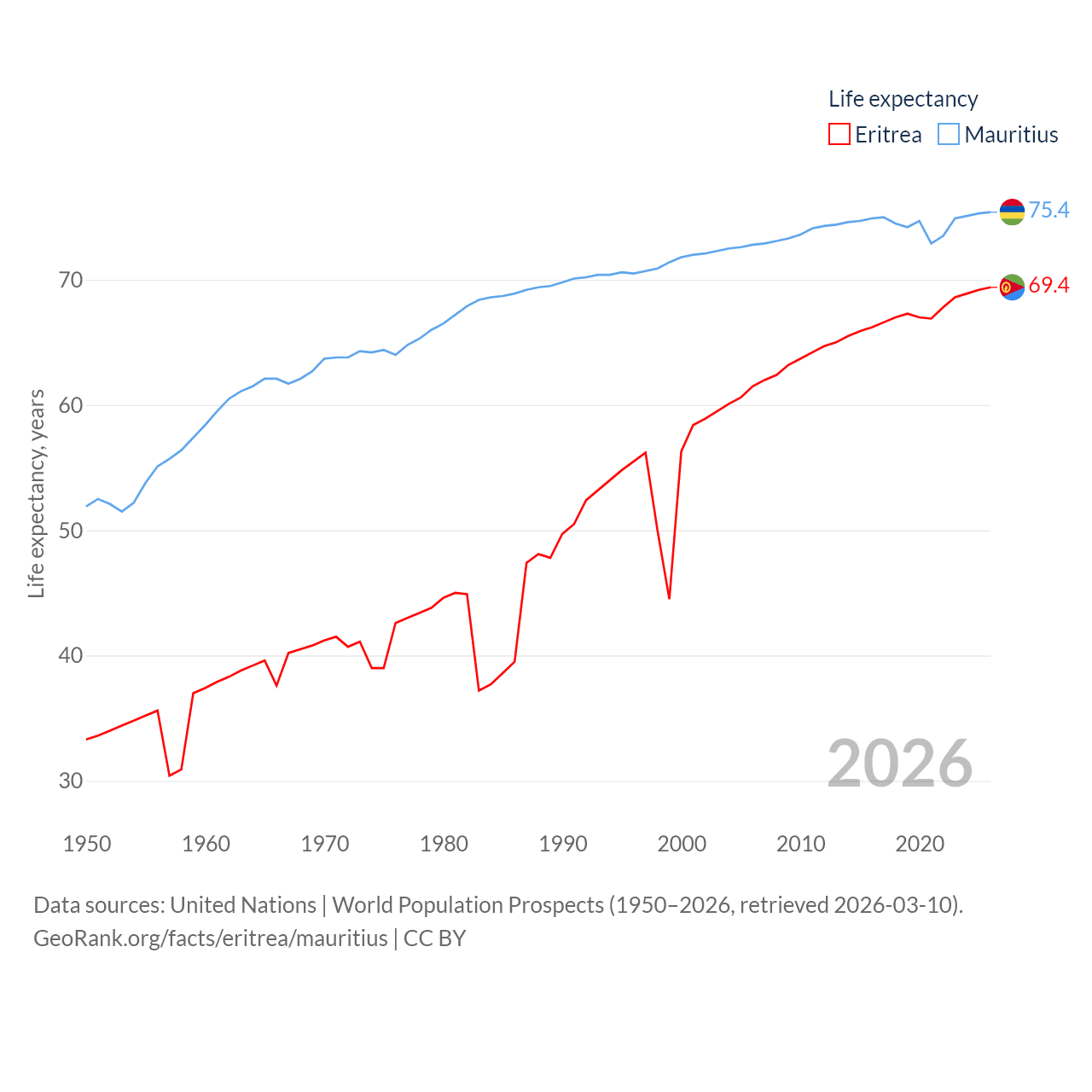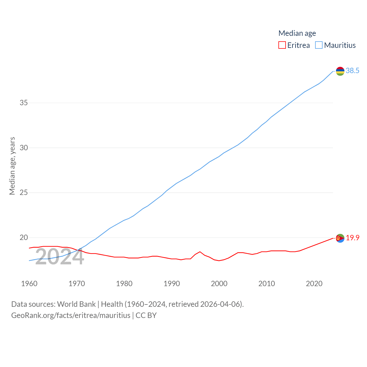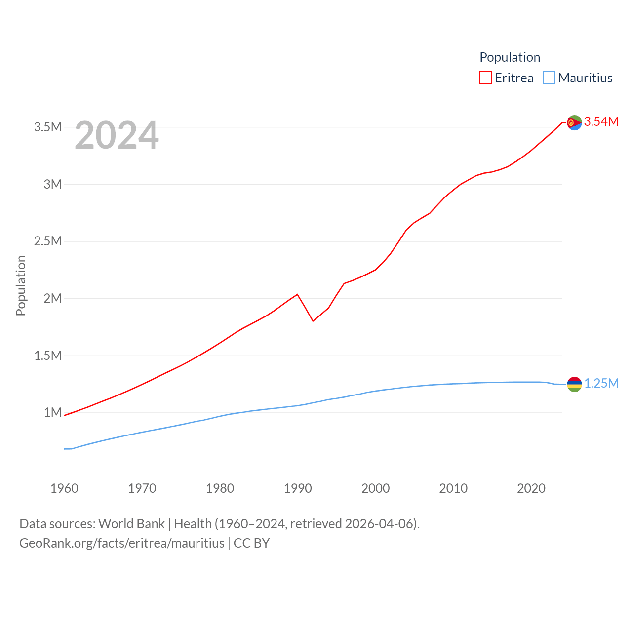Eritrea has a population of 3.54M (ranked 131/197), compared with 1.25M in Mauritius (ranked 156/197). Eritrea's land area is 46,787 sq mi versus 771 sq mi for Mauritius (ranked 96th vs. 170th).