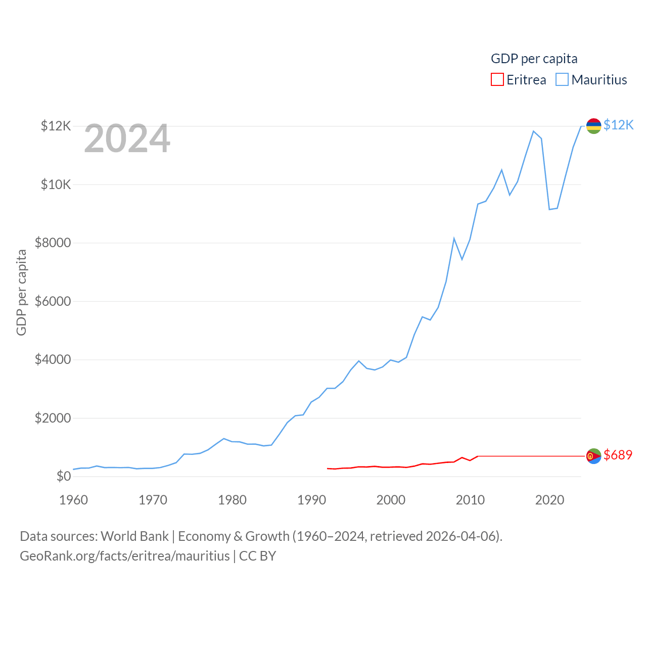 By GDP, Eritrea ranks 179/197 ($2.07B) and Mauritius ranks 143/197 ($14.9B). By GDP per capita, Eritrea ranks 188/197 ($689), while Mauritius ranks 78/197 ($11,991).
