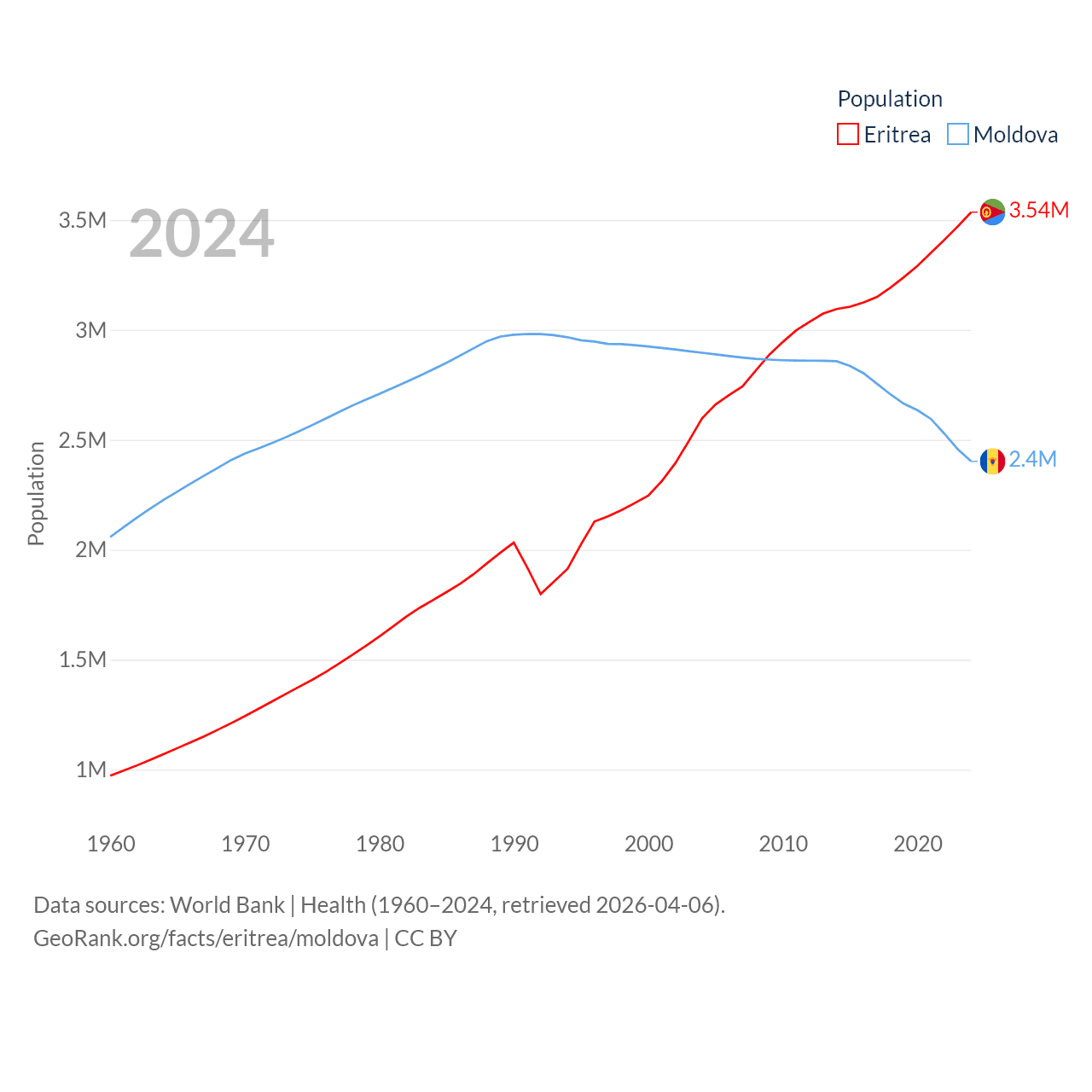 Eritrea has a population of 3.54M (ranked 131/197), compared with 2.4M in Moldova (ranked 143/197). Eritrea's land area is 46,787 sq mi versus 12,714 sq mi for Moldova (ranked 96th vs. 135th).