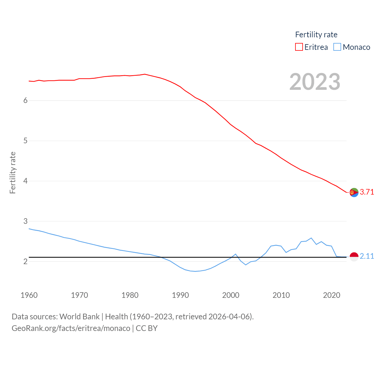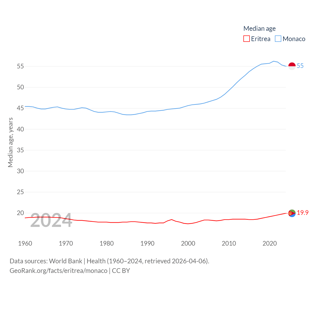 Eritrea has a population of 3.54M (ranked 131/197), compared with 38.6K in Monaco (ranked 191/197). Eritrea's land area is 46,787 sq mi versus 0.8 sq mi for Monaco (ranked 96th vs. 196th).