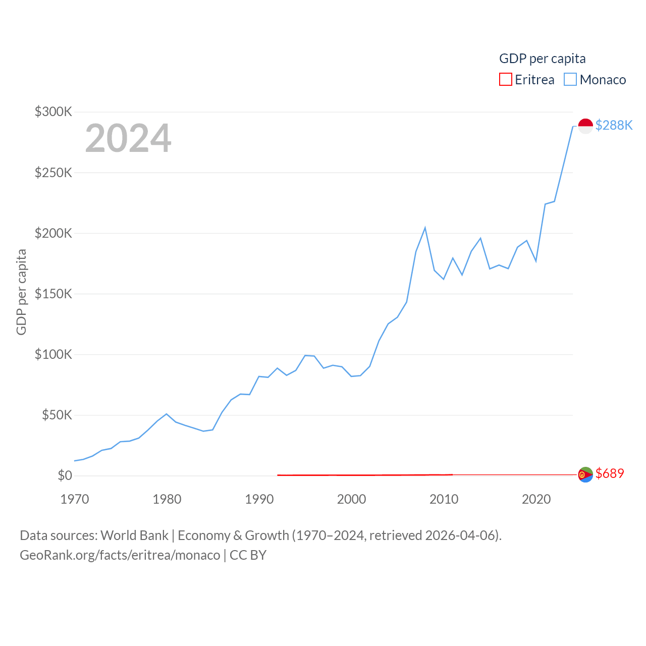 By GDP, Eritrea ranks 179/197 ($2.07B) and Monaco ranks 152/197 ($11.1B). By GDP per capita, Eritrea ranks 188/197 ($689), while Monaco ranks 1/197 ($288,001).