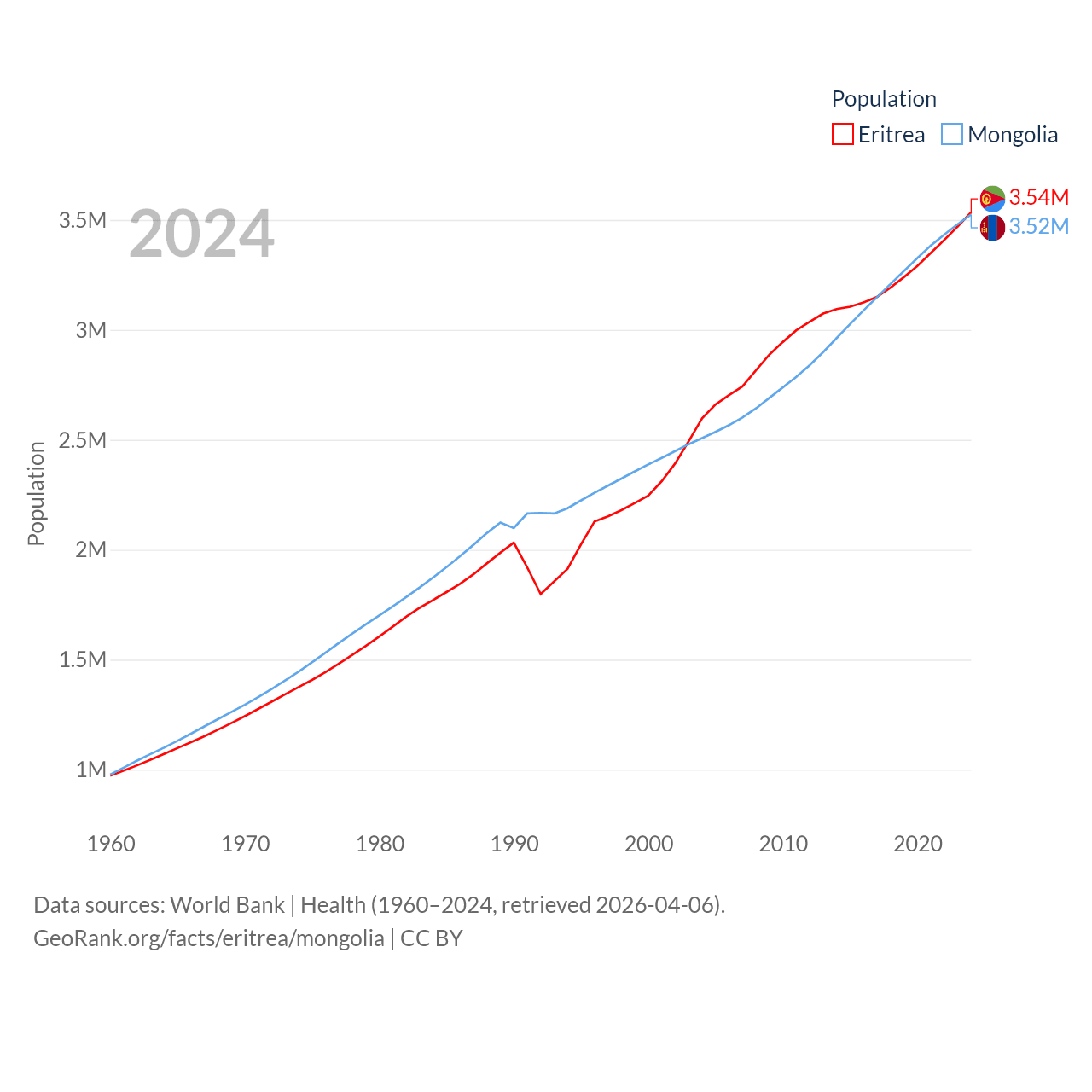 Eritrea has a population of 3.54M (ranked 131/197), compared with 3.52M in Mongolia (ranked 132/197). Eritrea's land area is 46,787 sq mi versus 601,740 sq mi for Mongolia (ranked 96th vs. 18th).