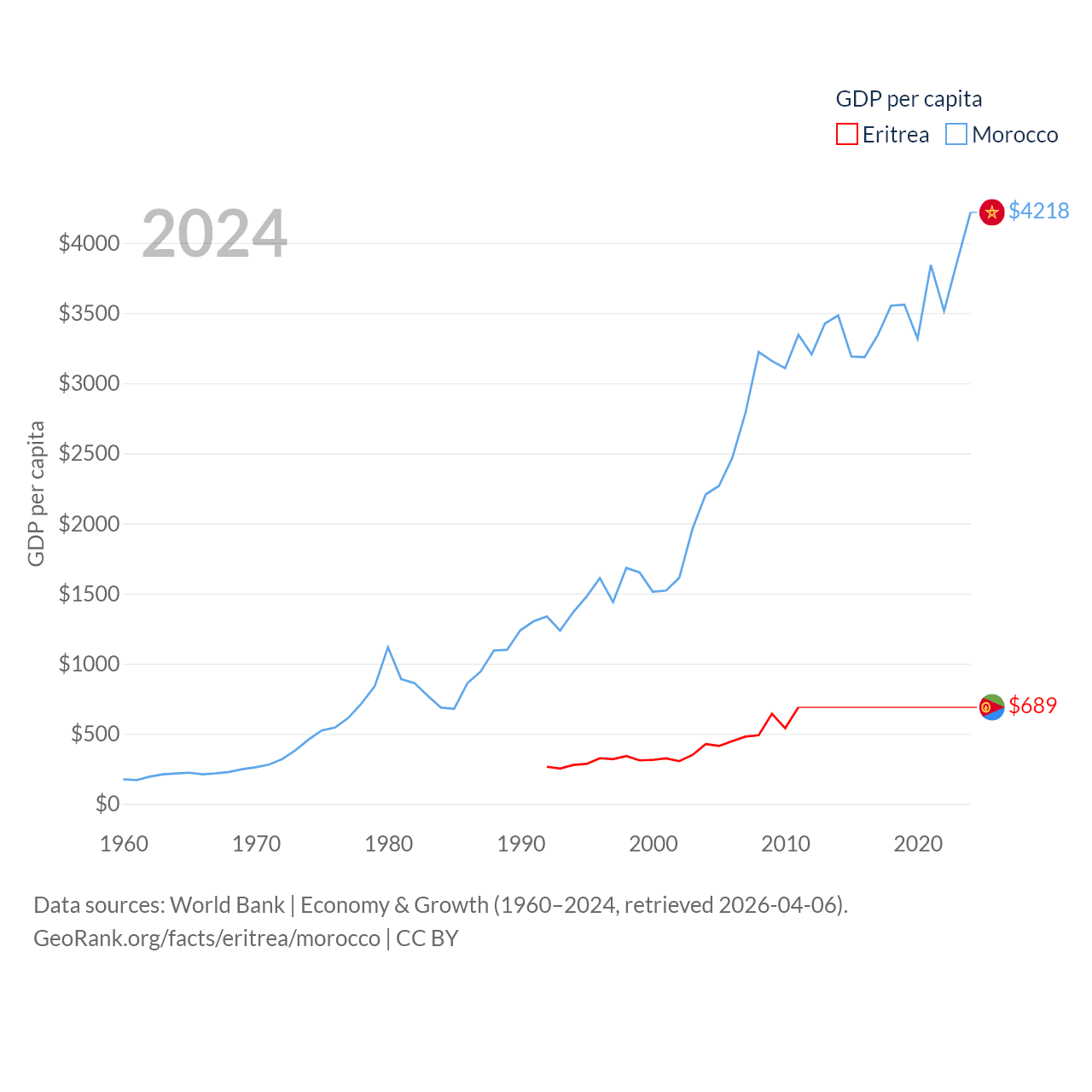 By GDP, Eritrea ranks 179/197 ($2.07B) and Morocco ranks 58/197 ($161B). By GDP per capita, Eritrea ranks 188/197 ($689), while Morocco ranks 127/197 ($4,218).