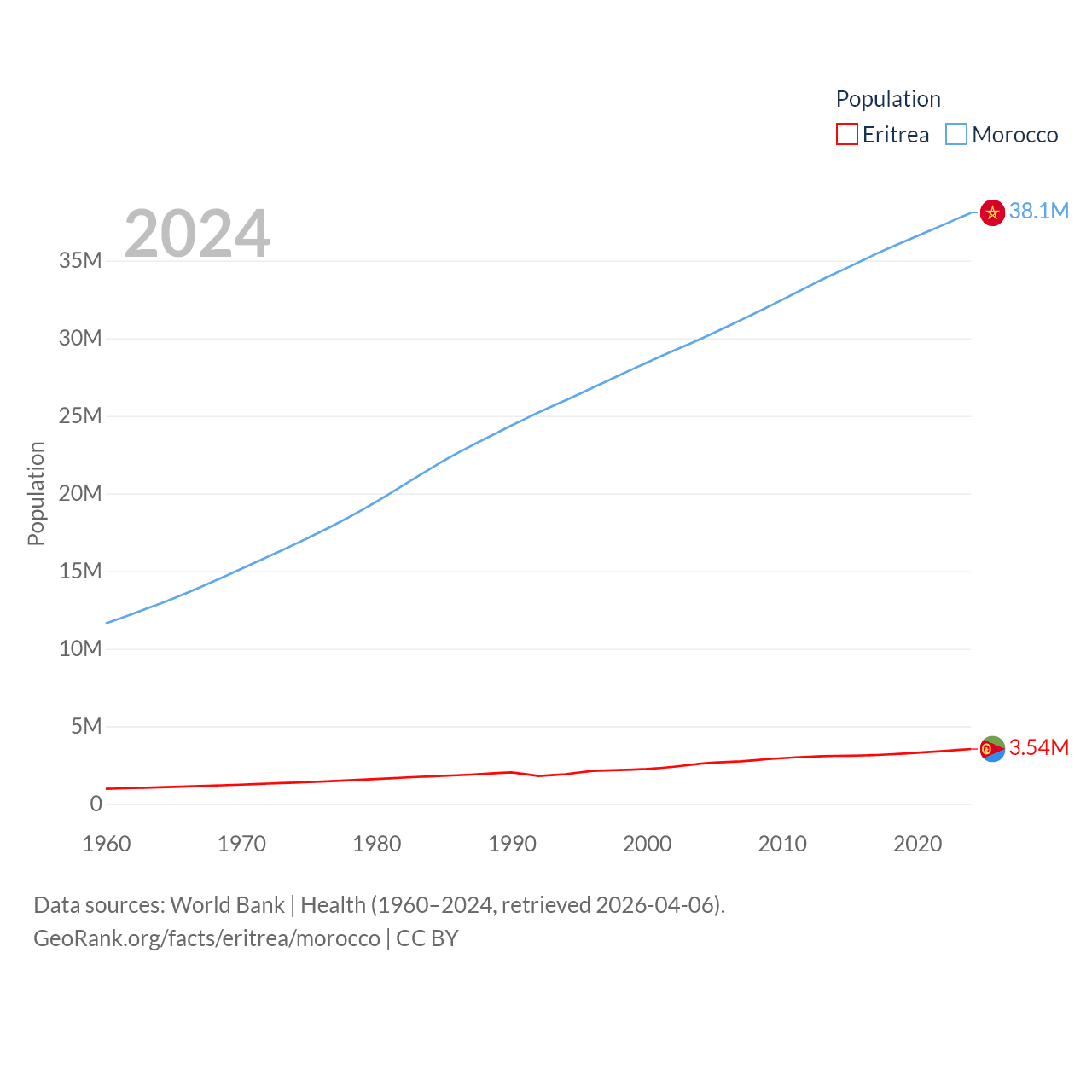 Eritrea has a population of 3.54M (ranked 131/197), compared with 38.1M in Morocco (ranked 39/197). Eritrea's land area is 46,787 sq mi versus 172,317 sq mi for Morocco (ranked 96th vs. 55th).