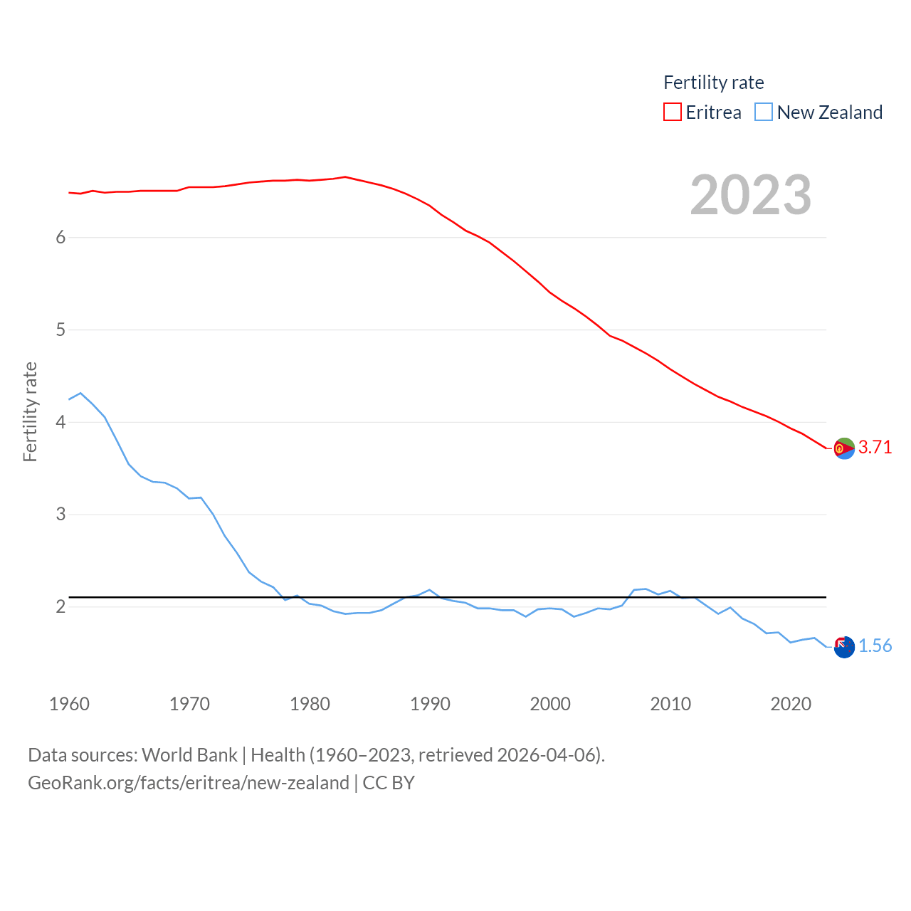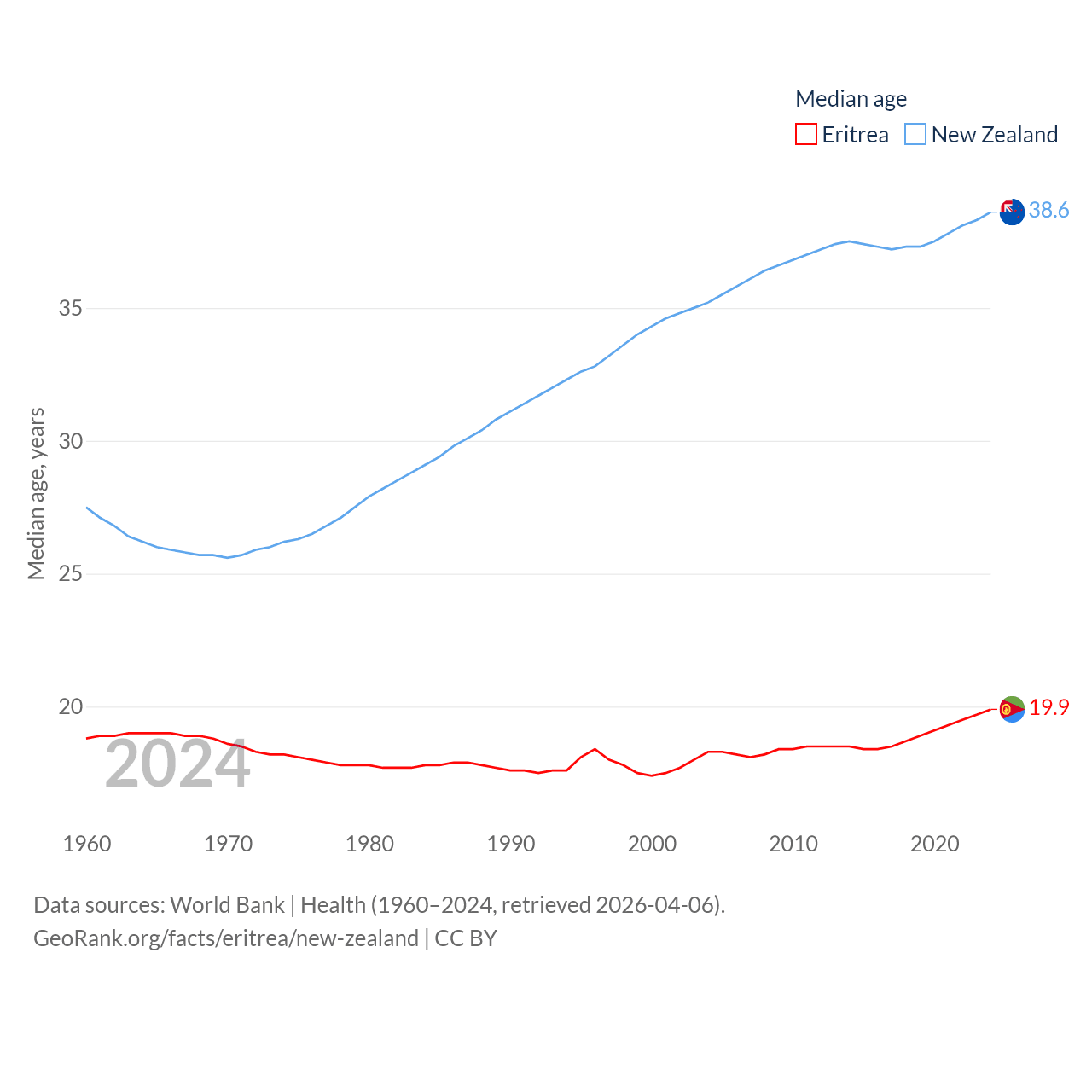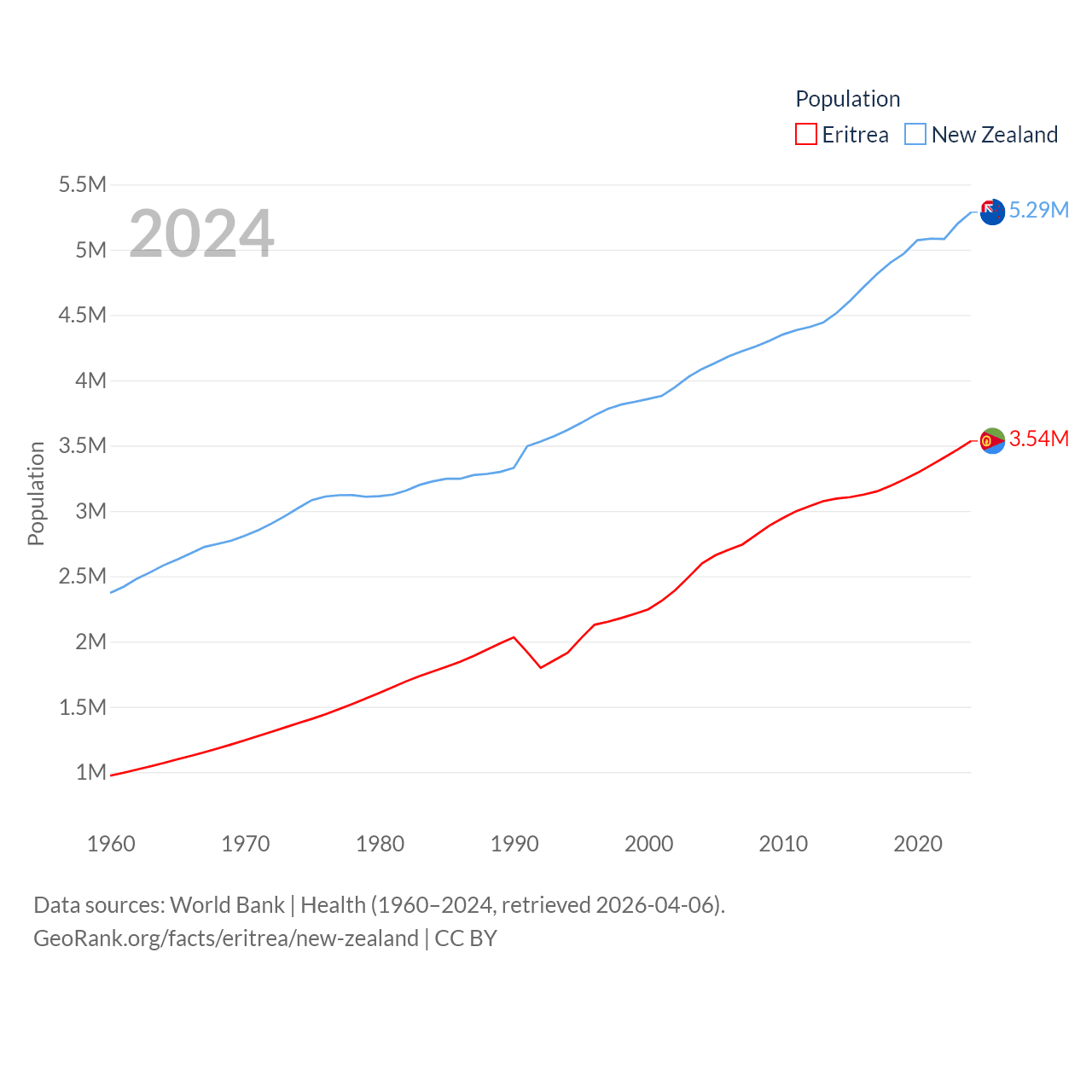 Eritrea has a population of 3.54M (ranked 131/197), compared with 5.29M in New Zealand (ranked 123/197). Eritrea's land area is 46,787 sq mi versus 101,665 sq mi for New Zealand (ranked 96th vs. 74th).
