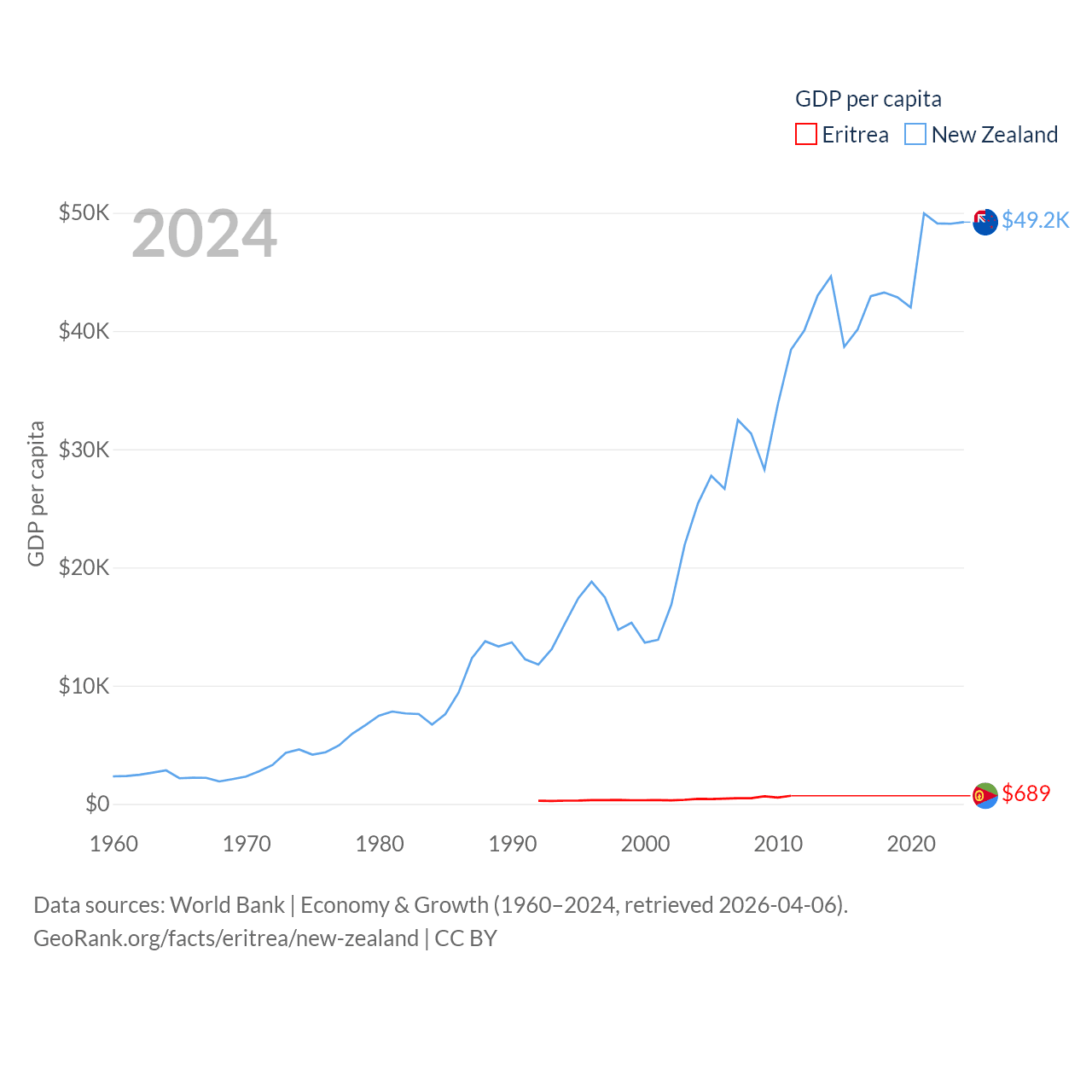 By GDP, Eritrea ranks 179/197 ($2.07B) and New Zealand ranks 52/197 ($260B). By GDP per capita, Eritrea ranks 188/197 ($689), while New Zealand ranks 26/197 ($49,205).