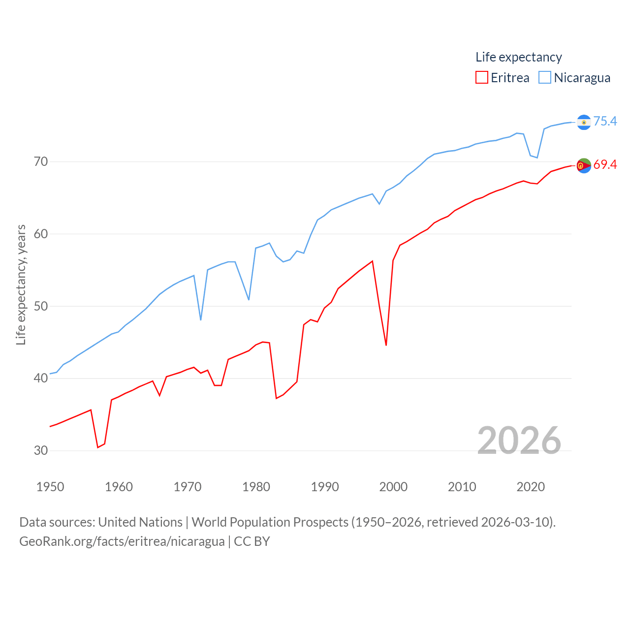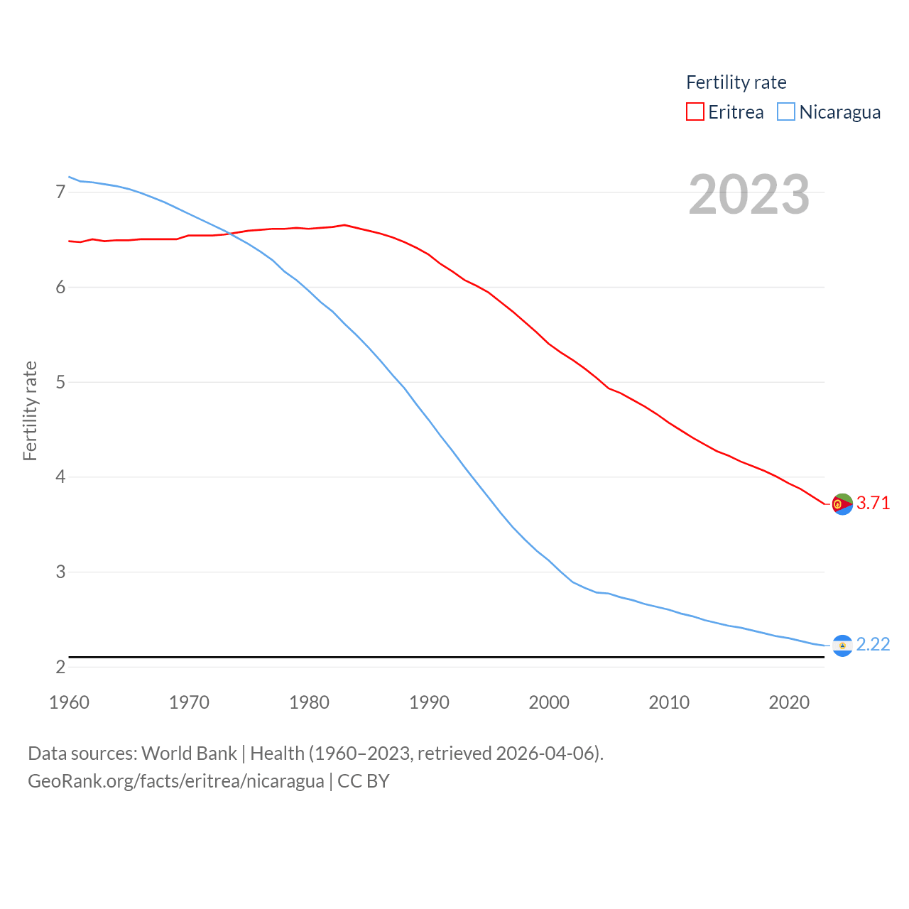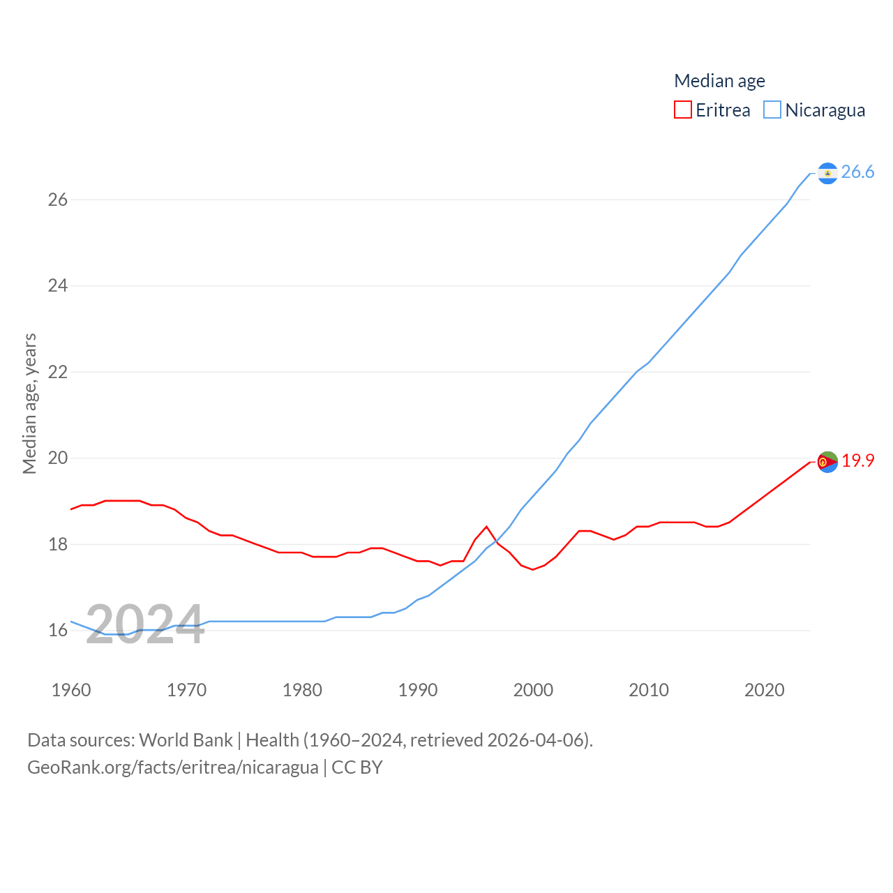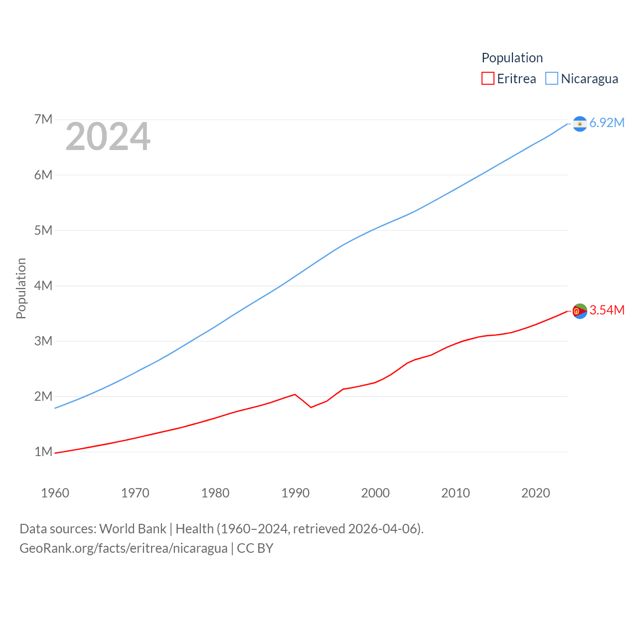 Eritrea has a population of 3.54M (ranked 131/197), compared with 6.92M in Nicaragua (ranked 108/197). Eritrea's land area is 46,787 sq mi versus 46,464 sq mi for Nicaragua (ranked 96th vs. 98th).