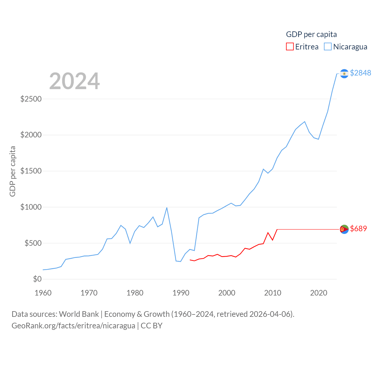 By GDP, Eritrea ranks 179/197 ($2.07B) and Nicaragua ranks 131/197 ($19.7B). By GDP per capita, Eritrea ranks 188/197 ($689), while Nicaragua ranks 141/197 ($2,848).