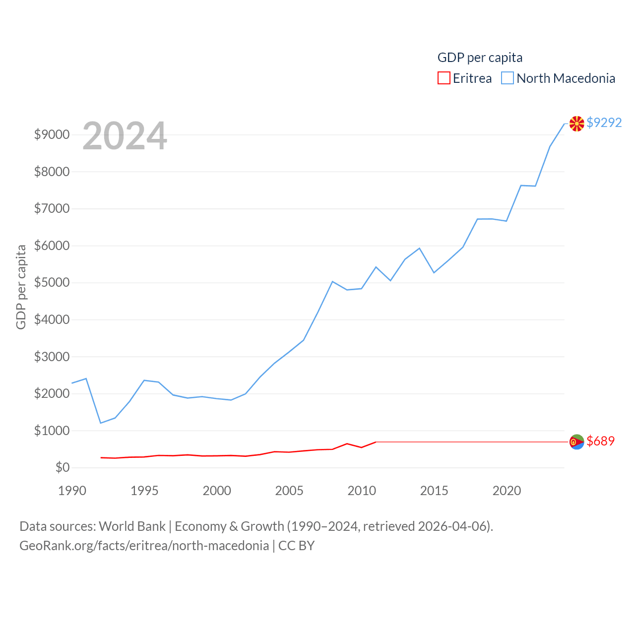 Data sources: World Bank | Economy & Growth (1990–2024, retrieved 2026-04-06).