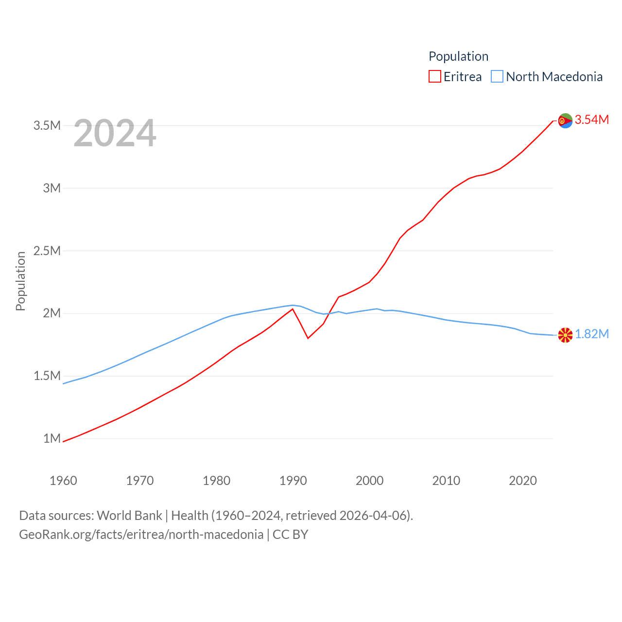Eritrea has a population of 3.54M (ranked 131/197), compared with 1.82M in North Macedonia (ranked 150/197). Eritrea's land area is 46,787 sq mi versus 9,737 sq mi for North Macedonia (ranked 96th vs. 145th).