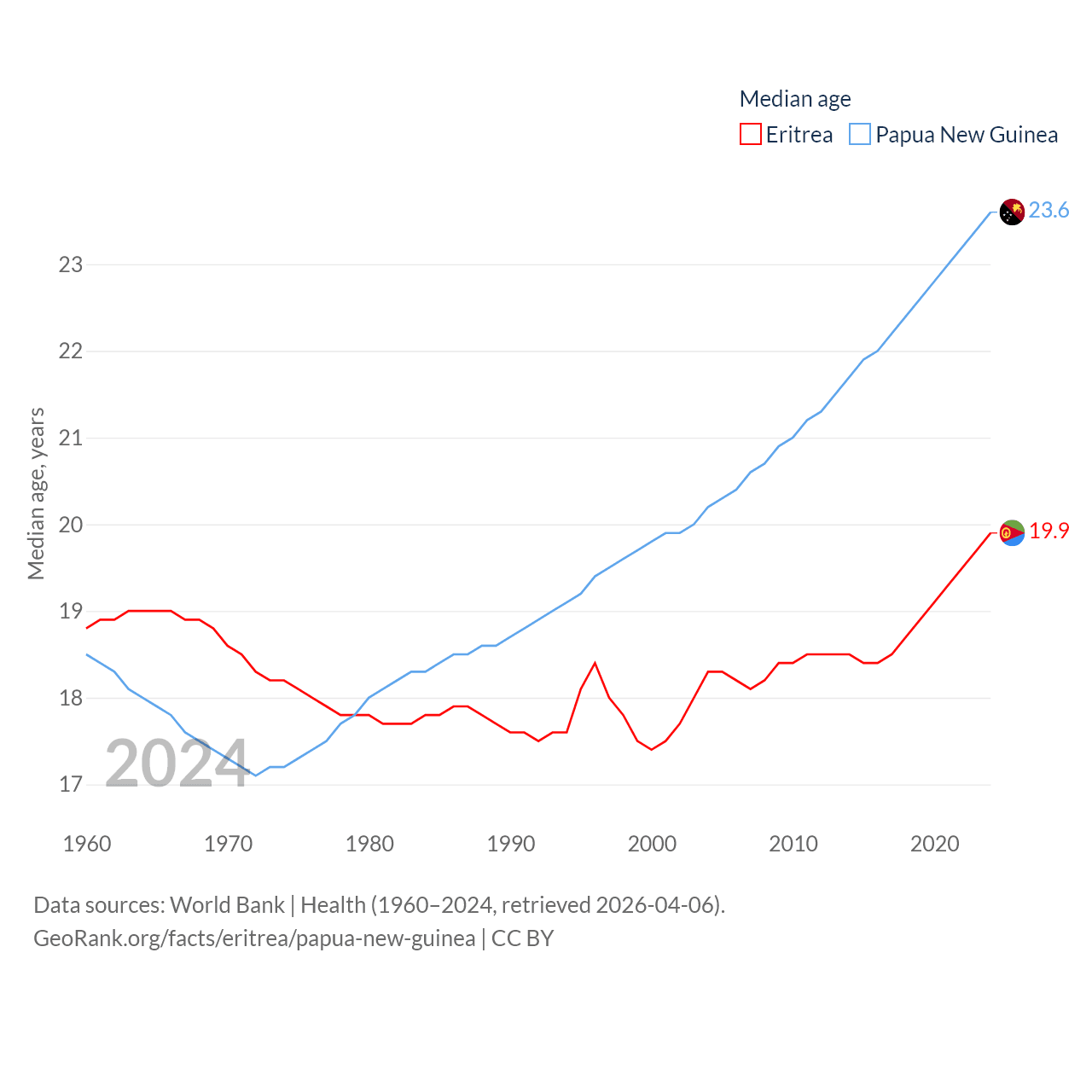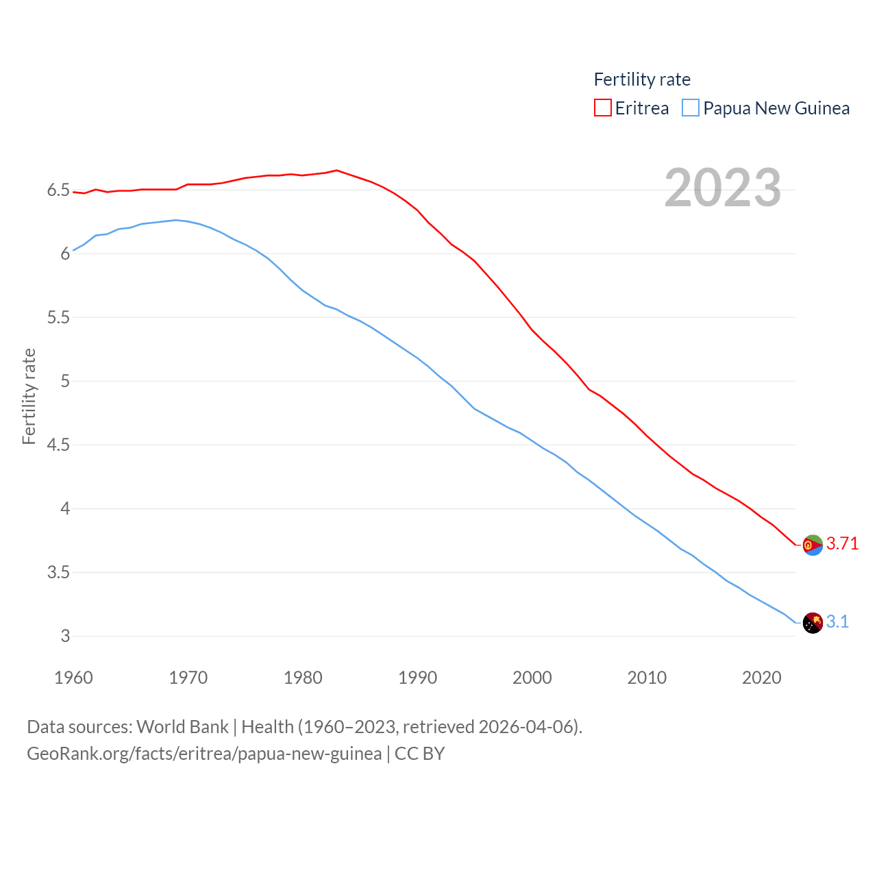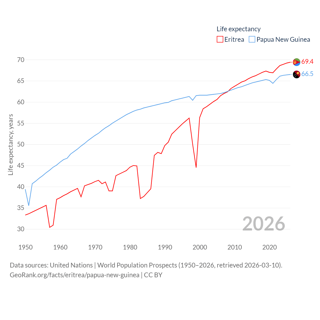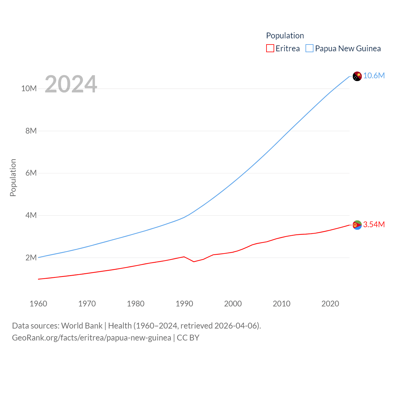 Eritrea has a population of 3.54M (ranked 131/197), compared with 10.6M in Papua New Guinea (ranked 92/197). Eritrea's land area is 46,787 sq mi versus 174,850 sq mi for Papua New Guinea (ranked 96th vs. 54th).