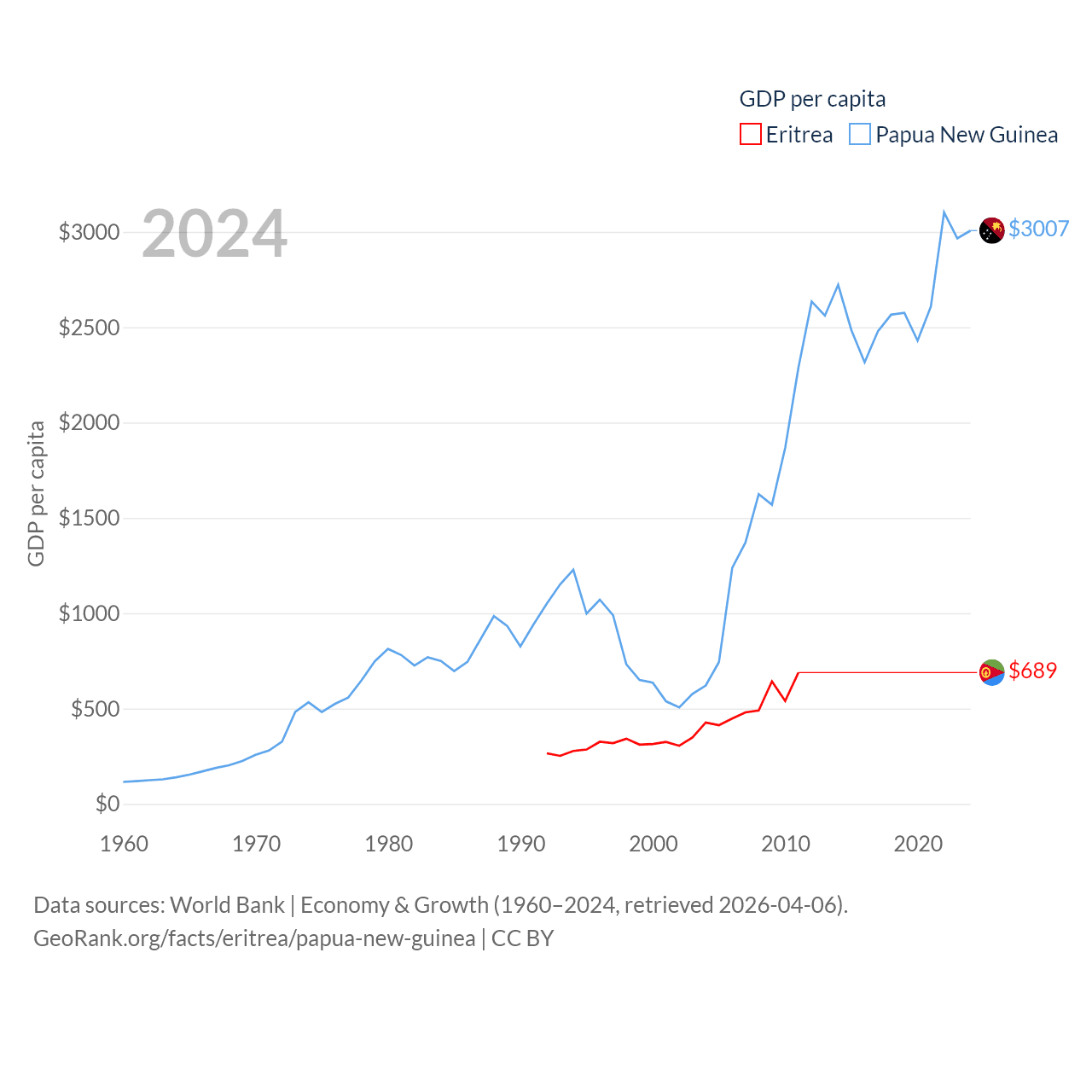 By GDP, Eritrea ranks 179/197 ($2.07B) and Papua New Guinea ranks 110/197 ($31.8B). By GDP per capita, Eritrea ranks 188/197 ($689), while Papua New Guinea ranks 140/197 ($3,007).