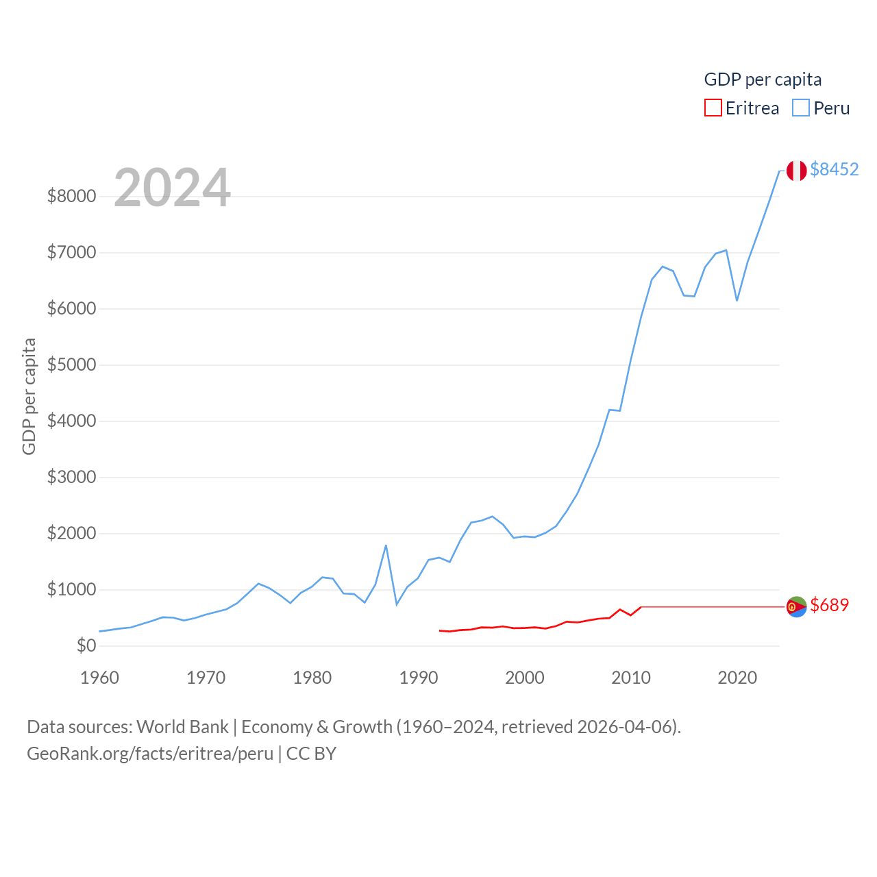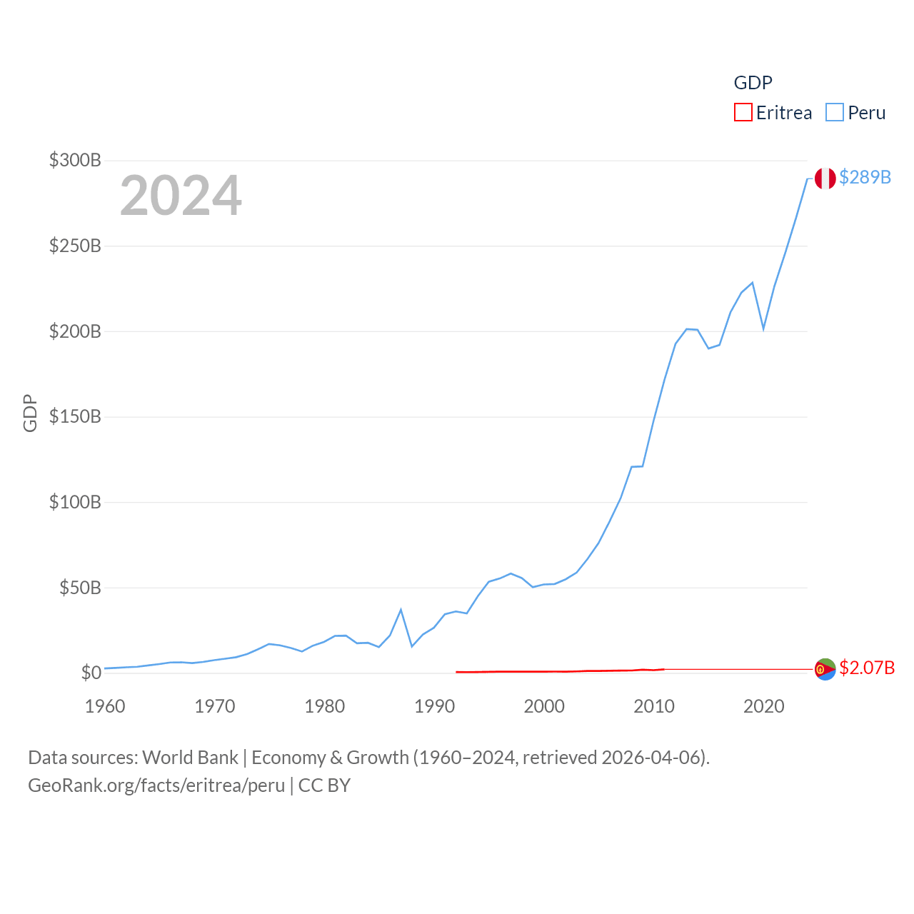 By GDP, Eritrea ranks 179/197 ($2.07B) and Peru ranks 49/197 ($289B). By GDP per capita, Eritrea ranks 188/197 ($689), while Peru ranks 91/197 ($8,452).