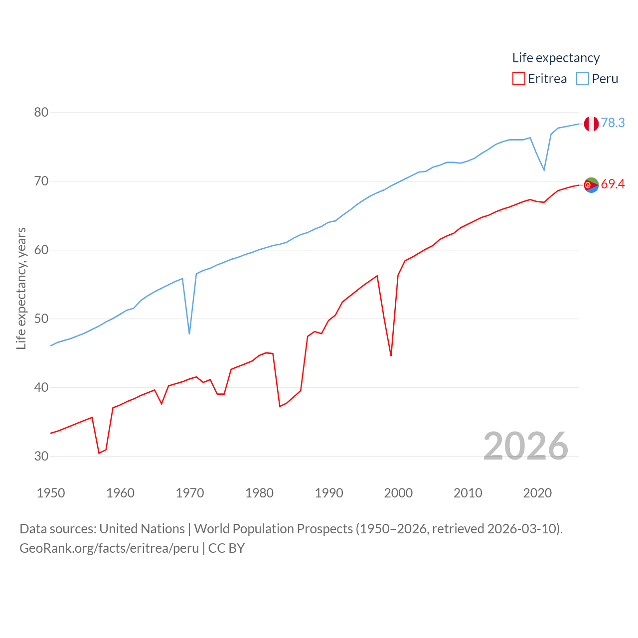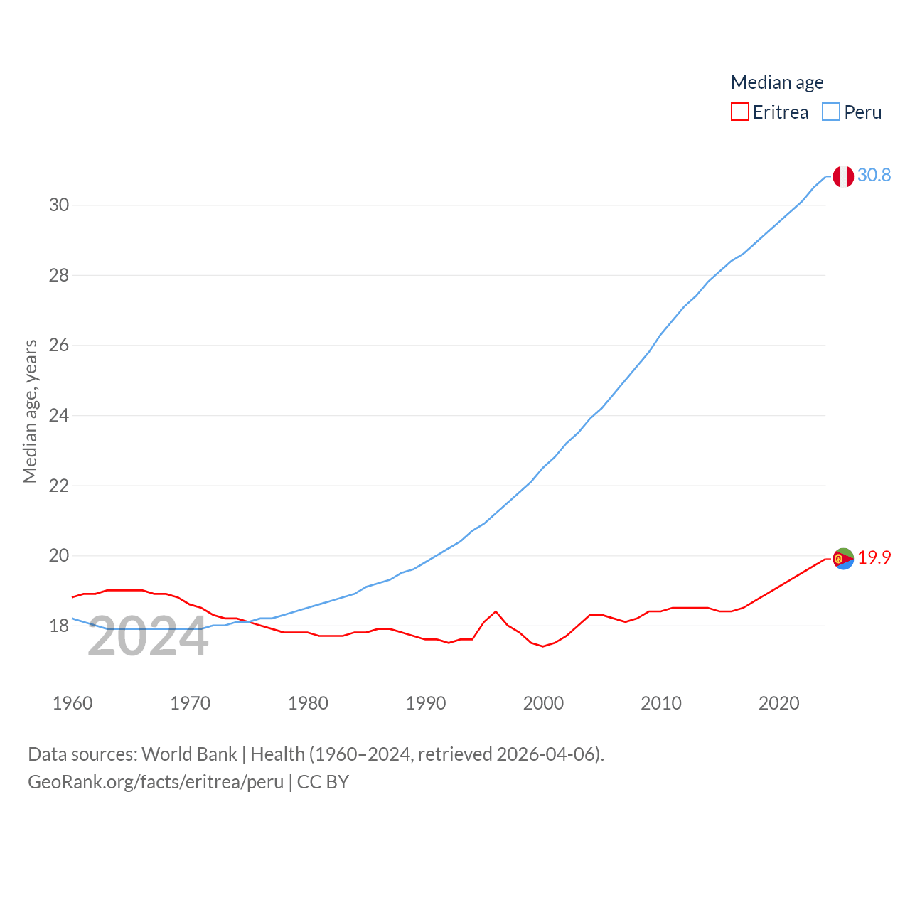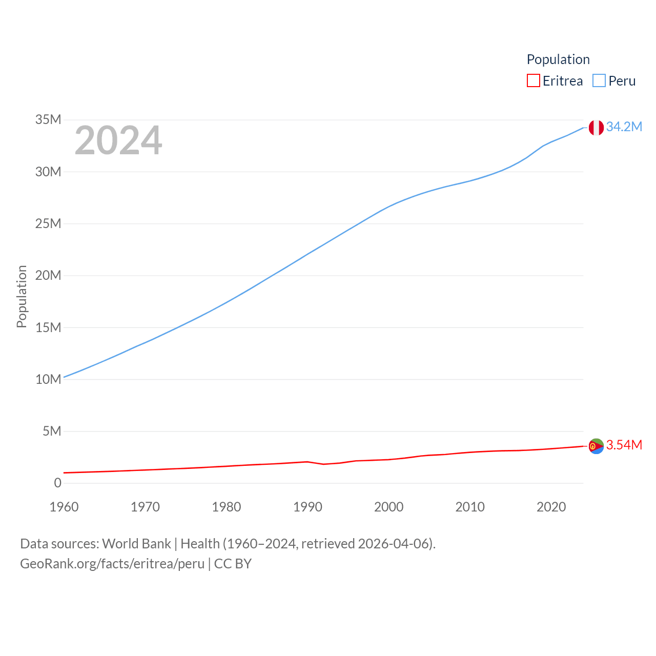 Eritrea has a population of 3.54M (ranked 131/197), compared with 34.2M in Peru (ranked 48/197). Eritrea's land area is 46,787 sq mi versus 494,211 sq mi for Peru (ranked 96th vs. 19th).