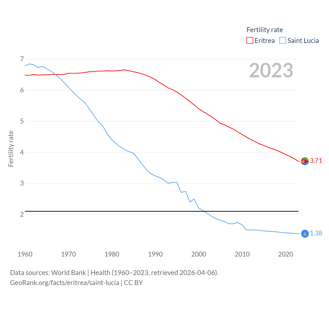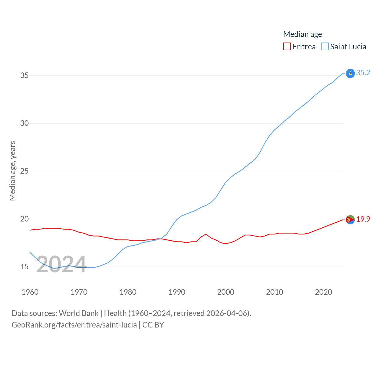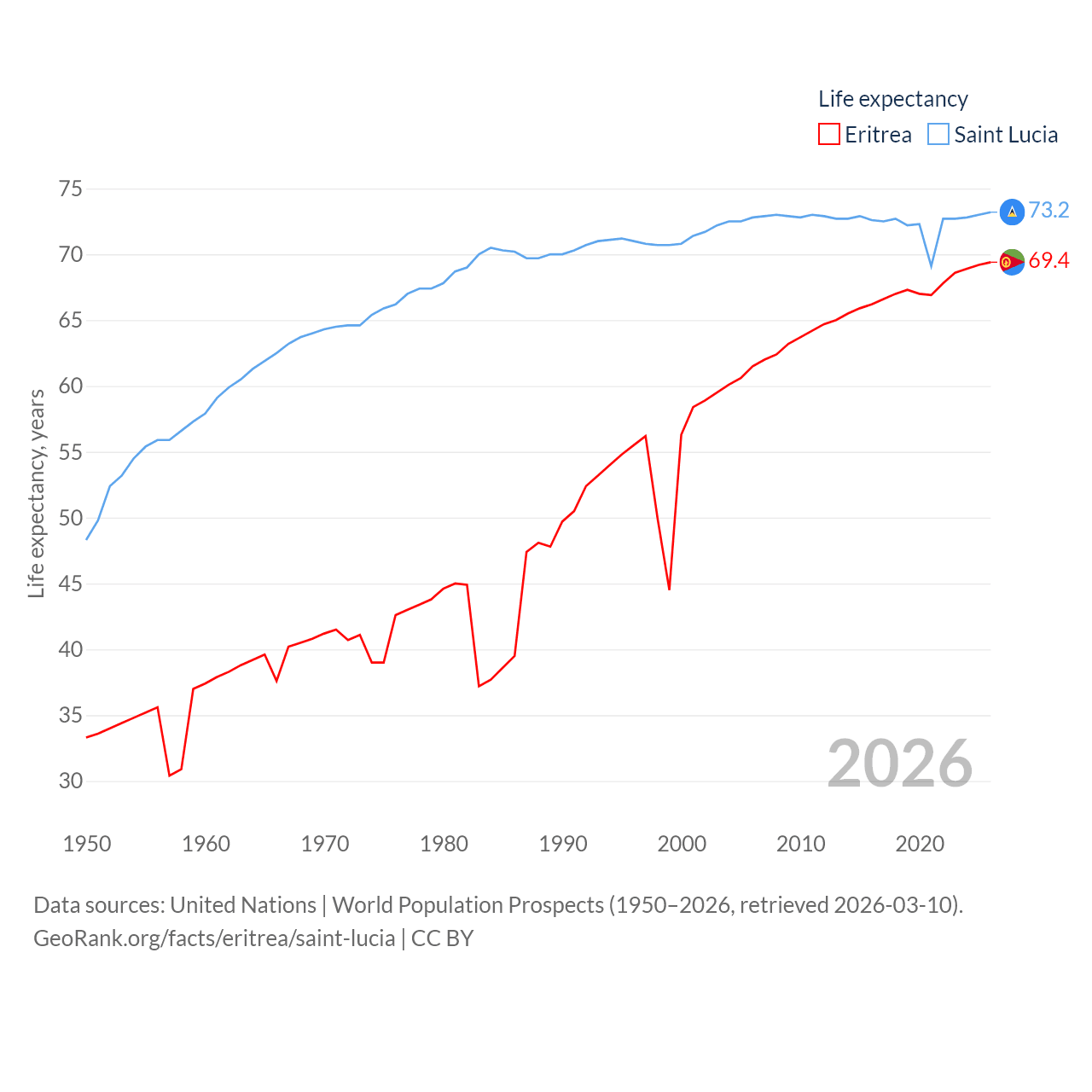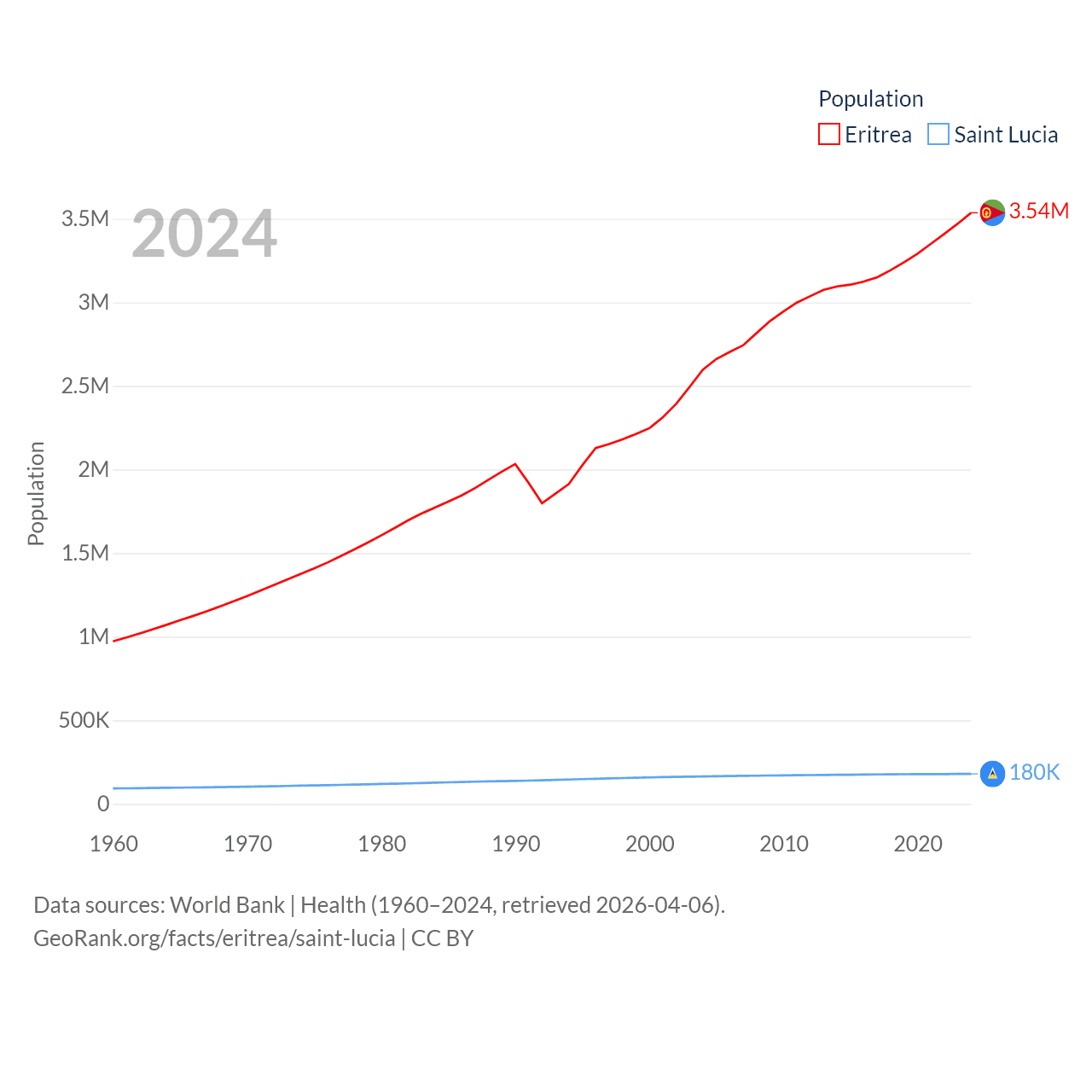 Eritrea has a population of 3.54M (ranked 131/197), compared with 180K in Saint Lucia (ranked 178/197). Eritrea's land area is 46,787 sq mi versus 235.5 sq mi for Saint Lucia (ranked 96th vs. 178th).