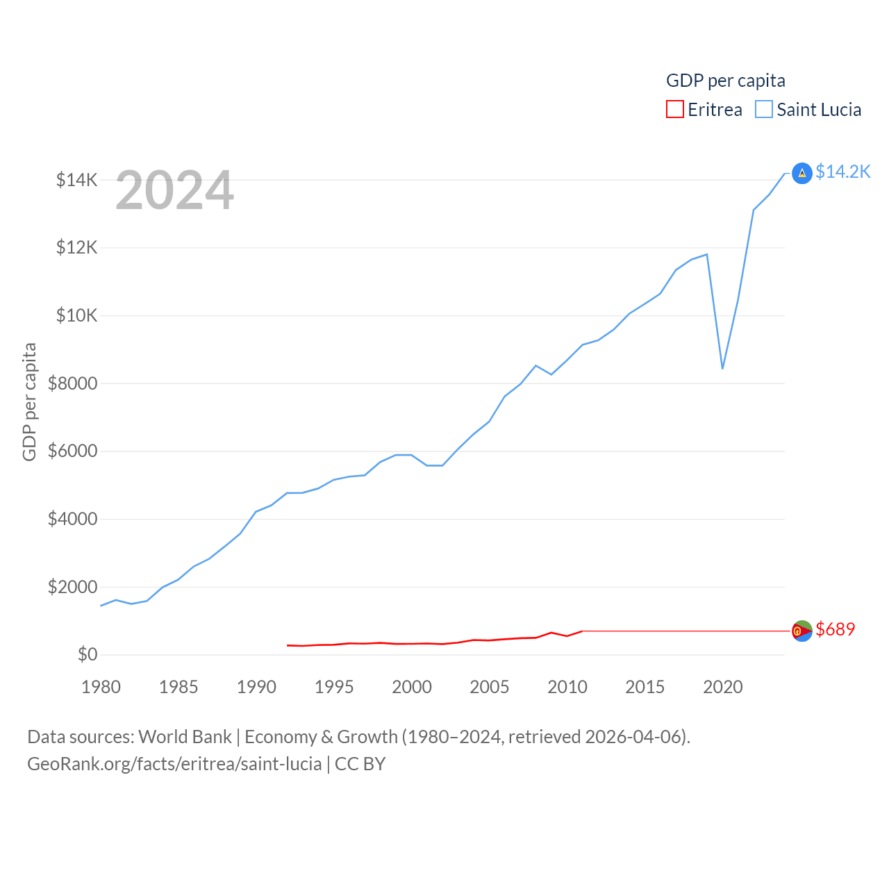 By GDP, Eritrea ranks 179/197 ($2.07B) and Saint Lucia ranks 173/197 ($2.55B). By GDP per capita, Eritrea ranks 188/197 ($689), while Saint Lucia ranks 70/197 ($14,182).