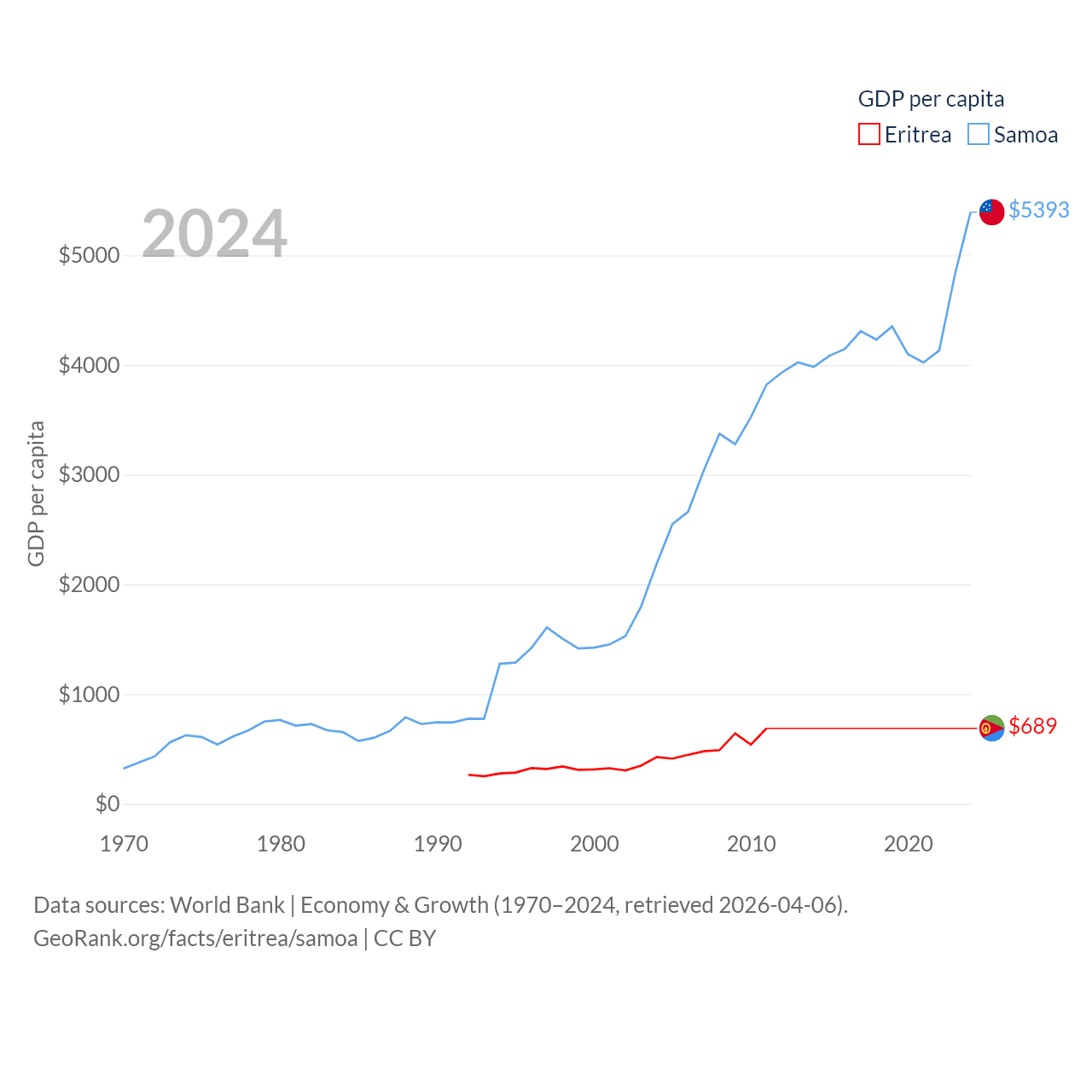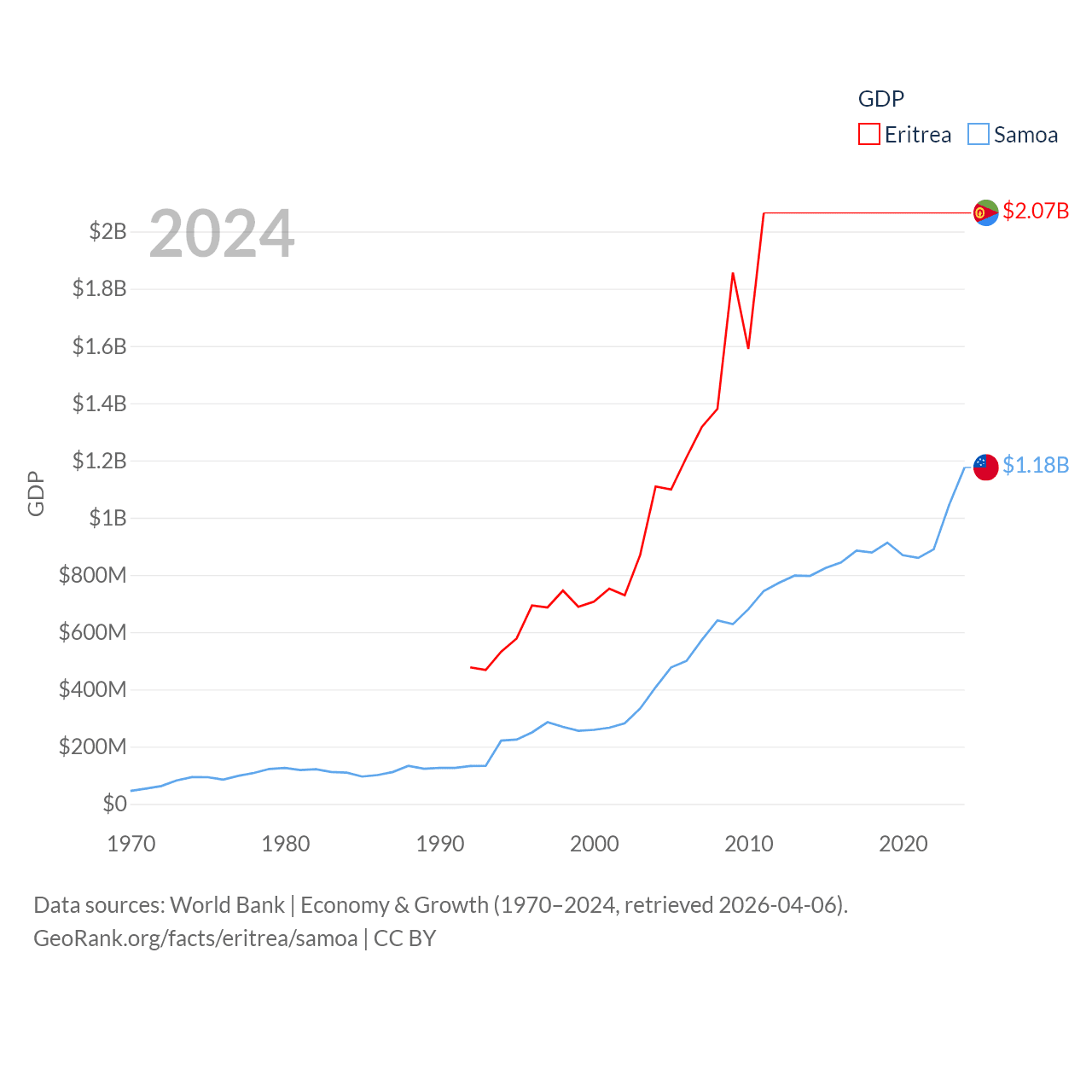 By GDP, Eritrea ranks 179/197 ($2.07B) and Samoa ranks 185/197 ($1.18B). By GDP per capita, Eritrea ranks 188/197 ($689), while Samoa ranks 117/197 ($5,393).