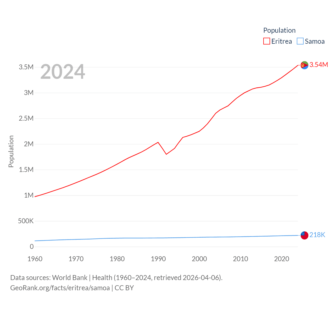 Eritrea has a population of 3.54M (ranked 131/197), compared with 218K in Samoa (ranked 177/197). Eritrea's land area is 46,787 sq mi versus 1,073 sq mi for Samoa (ranked 96th vs. 168th).