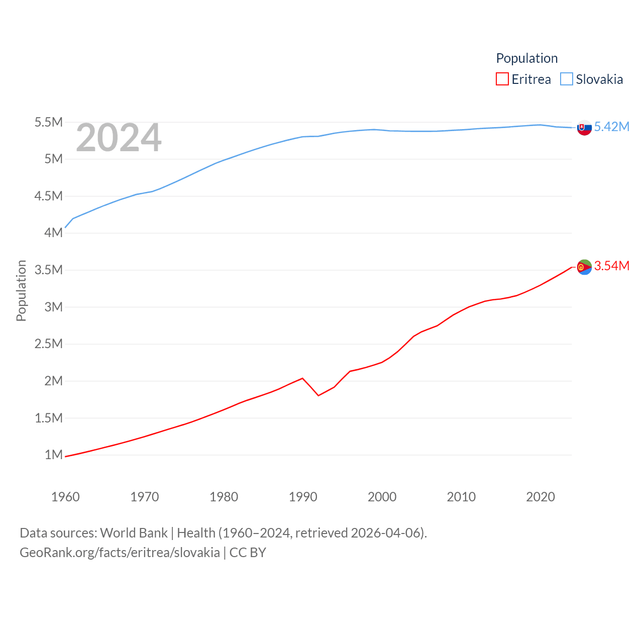 Eritrea has a population of 3.54M (ranked 131/197), compared with 5.42M in Slovakia (ranked 119/197). Eritrea's land area is 46,787 sq mi versus 18,564 sq mi for Slovakia (ranked 96th vs. 128th).