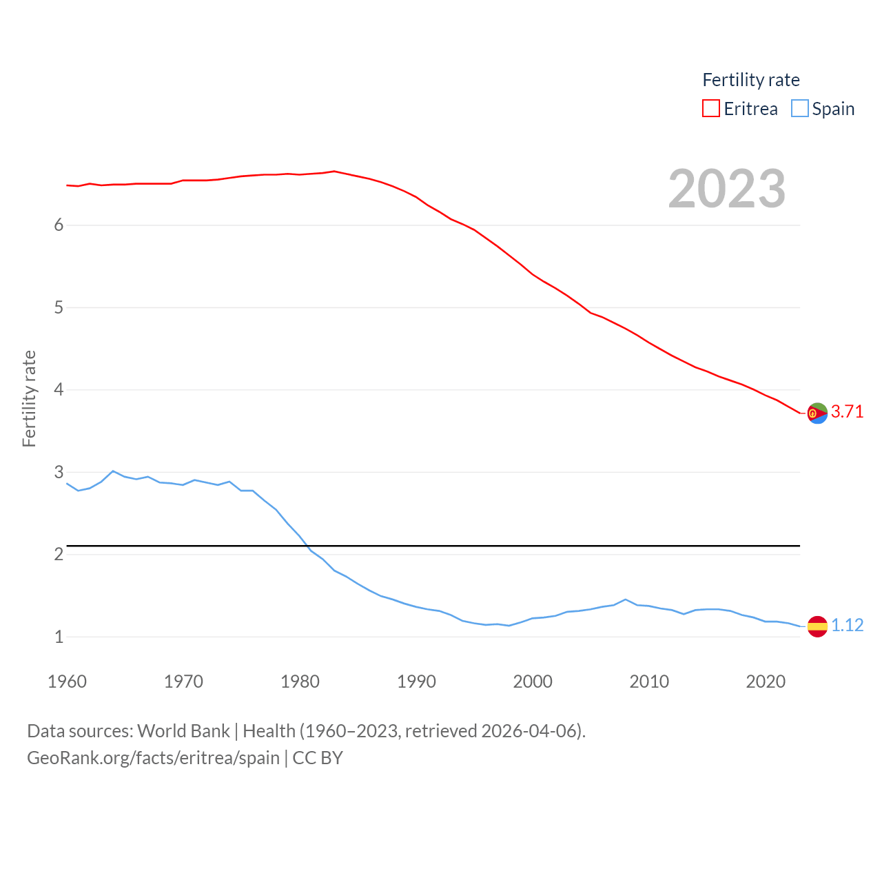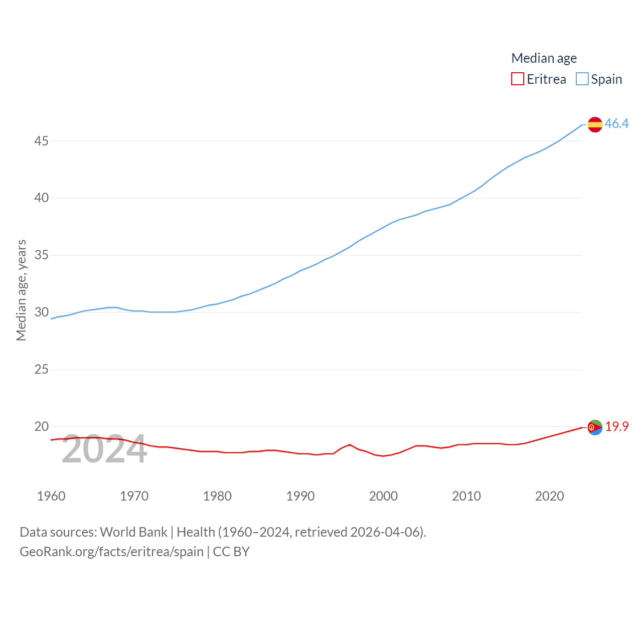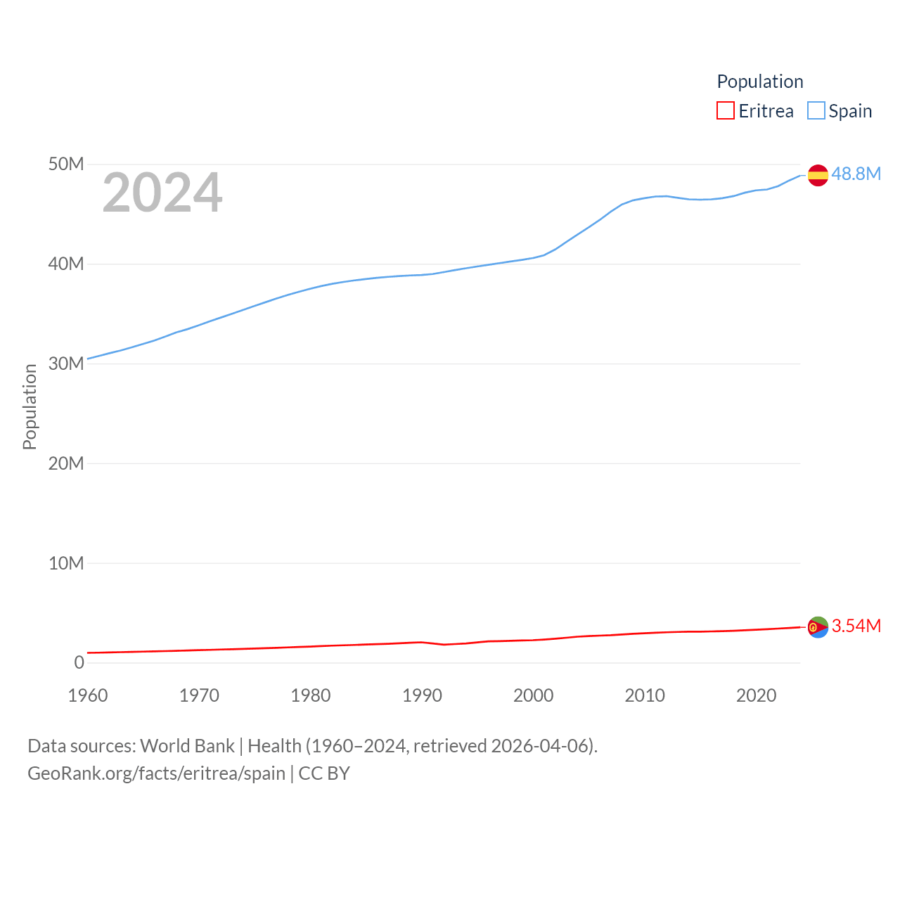 Eritrea has a population of 3.54M (ranked 131/197), compared with 48.8M in Spain (ranked 32/197). Eritrea's land area is 46,787 sq mi versus 192,934 sq mi for Spain (ranked 96th vs. 51st).