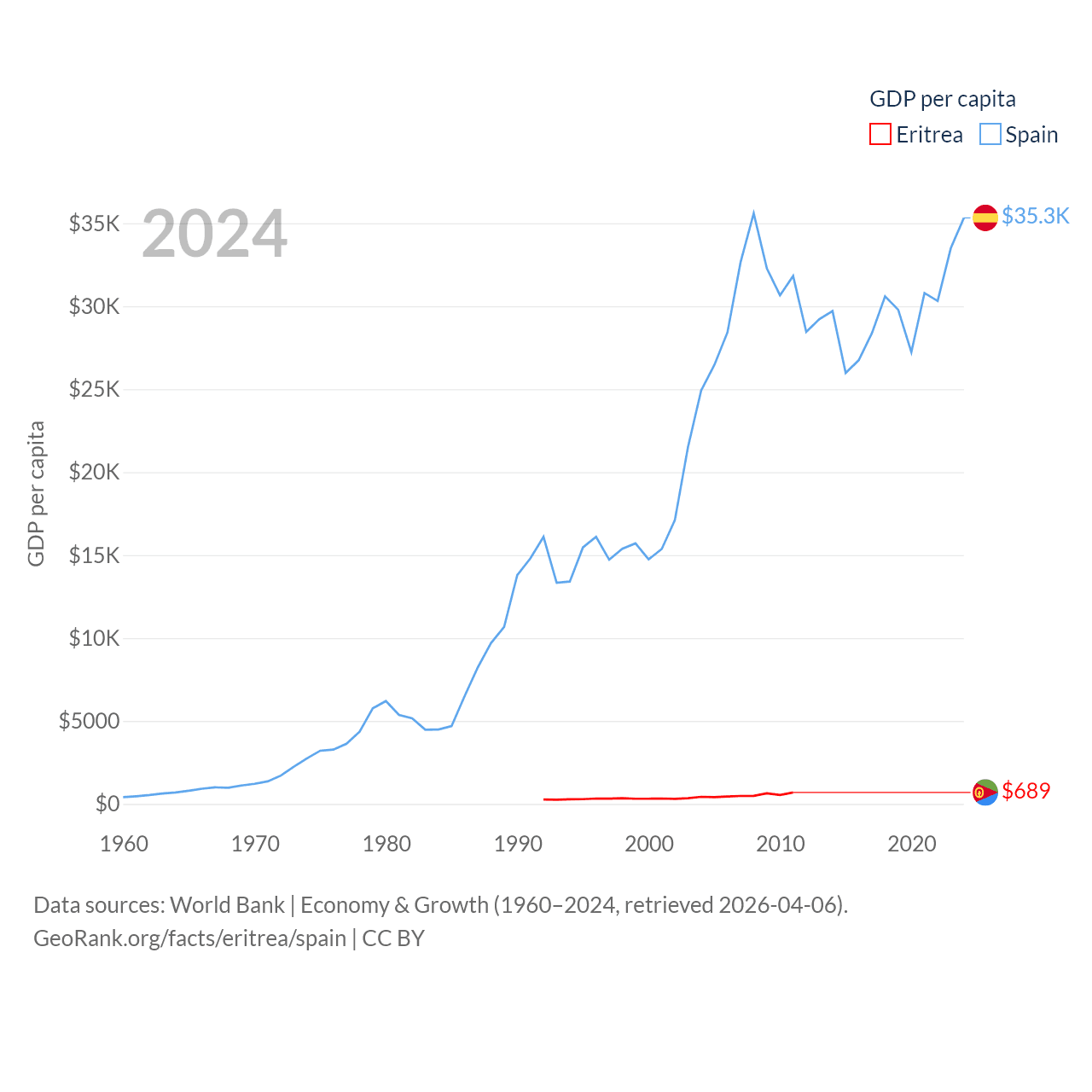 By GDP, Eritrea ranks 179/197 ($2.07B) and Spain ranks 15/197 ($1.73T). By GDP per capita, Eritrea ranks 188/197 ($689), while Spain ranks 32/197 ($35,327).