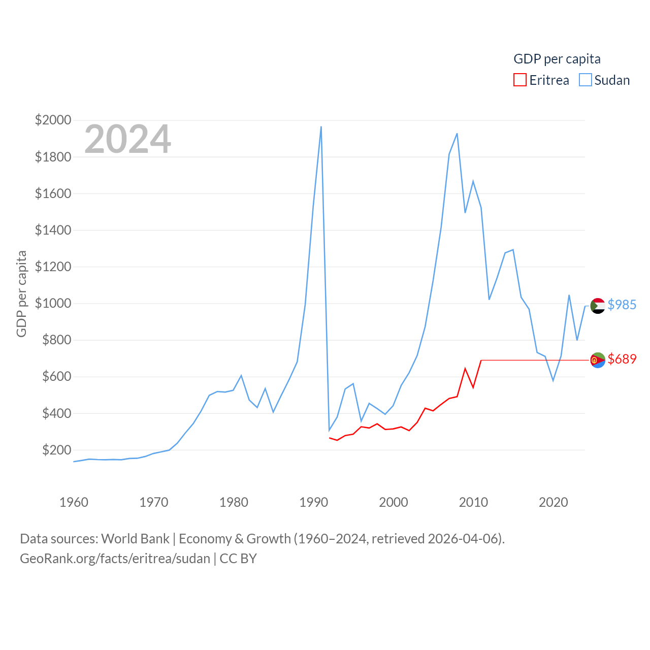 By GDP, Eritrea ranks 179/197 ($2.07B) and Sudan ranks 94/197 ($49.7B). By GDP per capita, Eritrea ranks 188/197 ($689), while Sudan ranks 179/197 ($985).