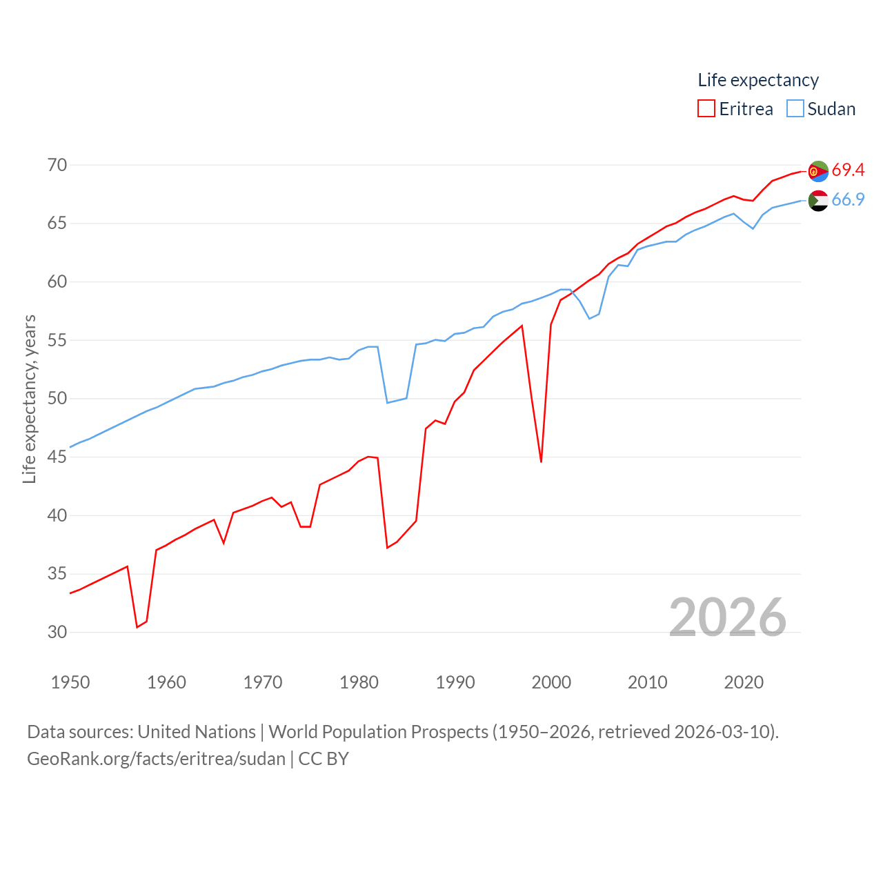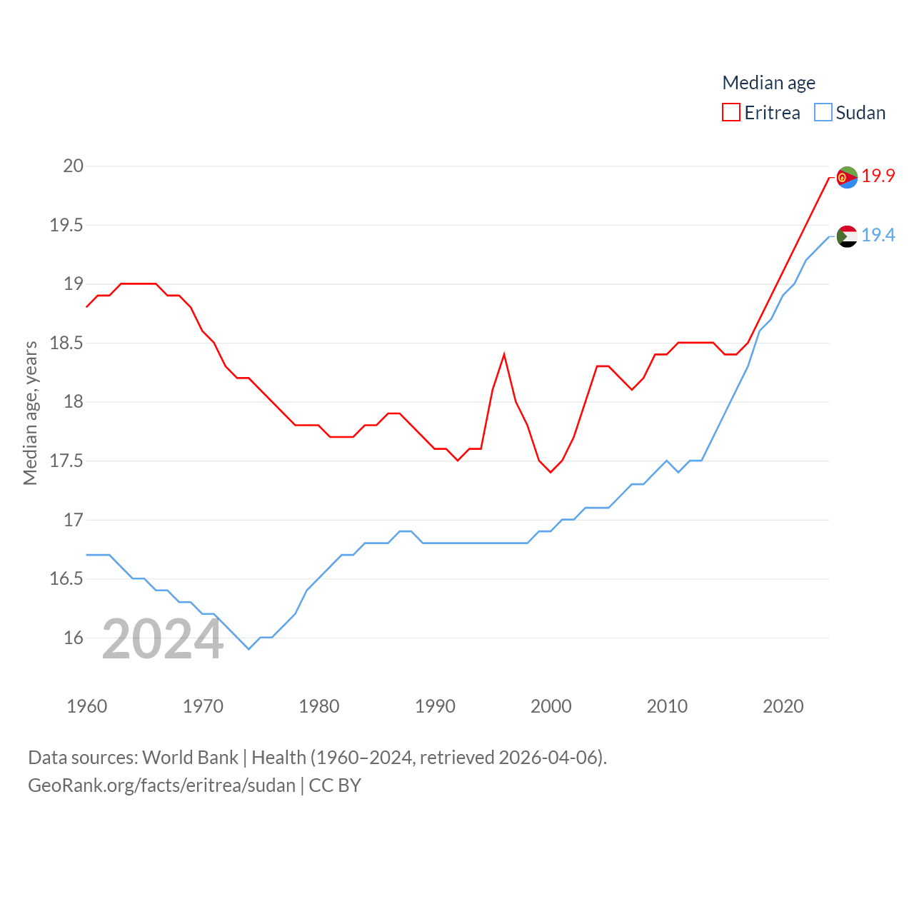 Eritrea has a population of 3.54M (ranked 131/197), compared with 50.4M in Sudan (ranked 30/197). Eritrea's land area is 46,787 sq mi versus 721,239 sq mi for Sudan (ranked 96th vs. 15th).