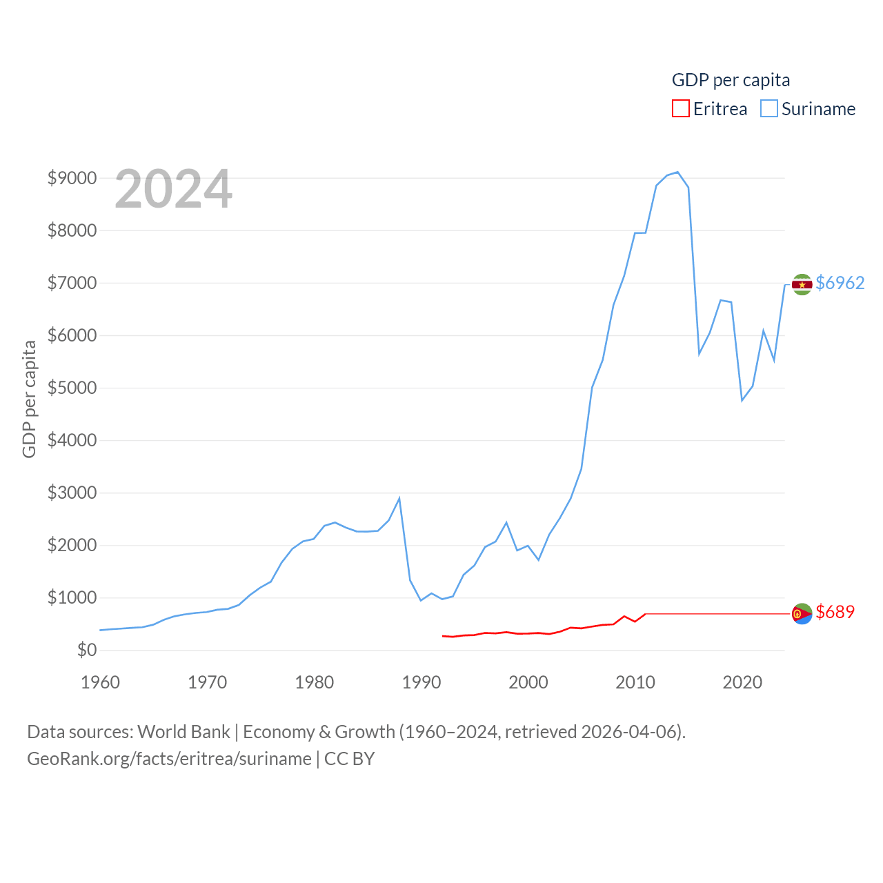 By GDP, Eritrea ranks 179/197 ($2.07B) and Suriname ranks 164/197 ($4.42B). By GDP per capita, Eritrea ranks 188/197 ($689), while Suriname ranks 102/197 ($6,962).