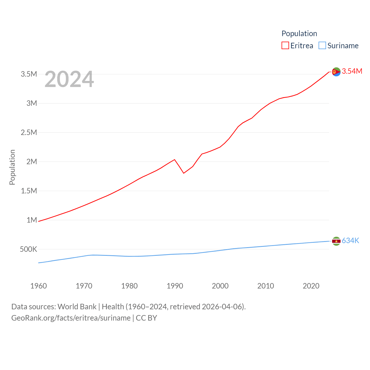 Eritrea has a population of 3.54M (ranked 131/197), compared with 634K in Suriname (ranked 165/197). Eritrea's land area is 46,787 sq mi versus 61,972 sq mi for Suriname (ranked 96th vs. 90th).