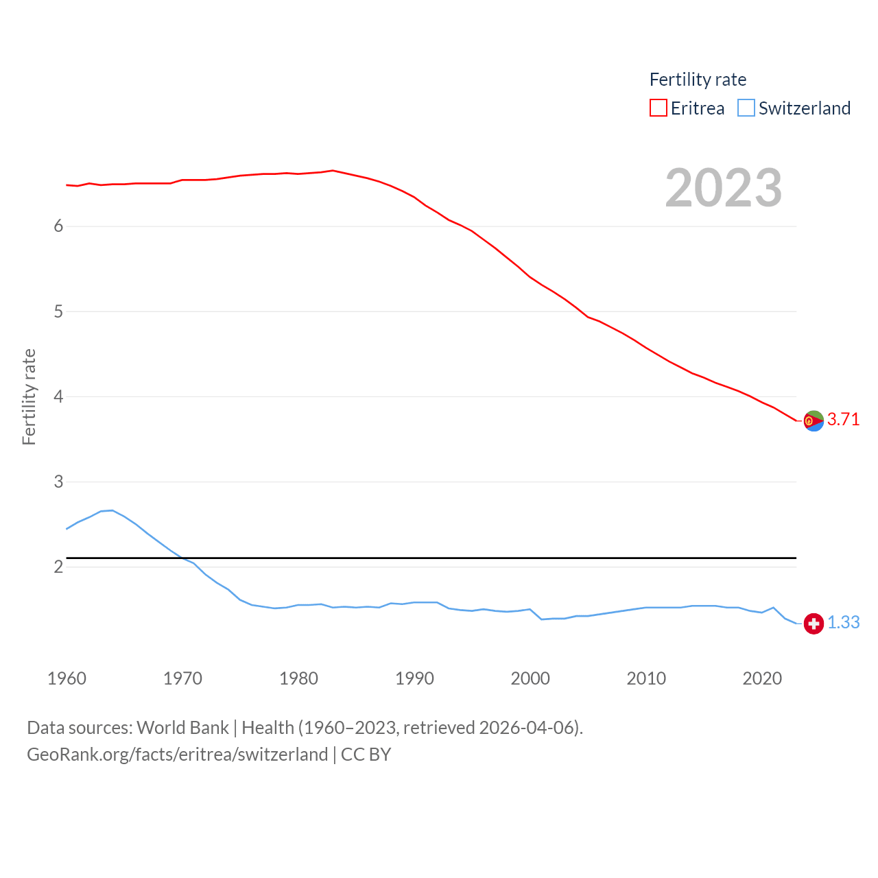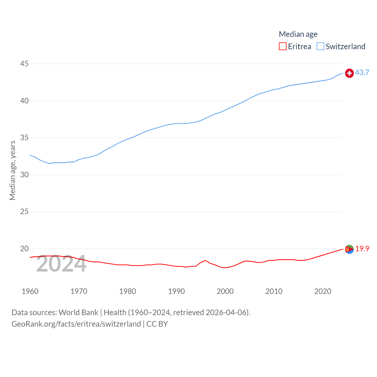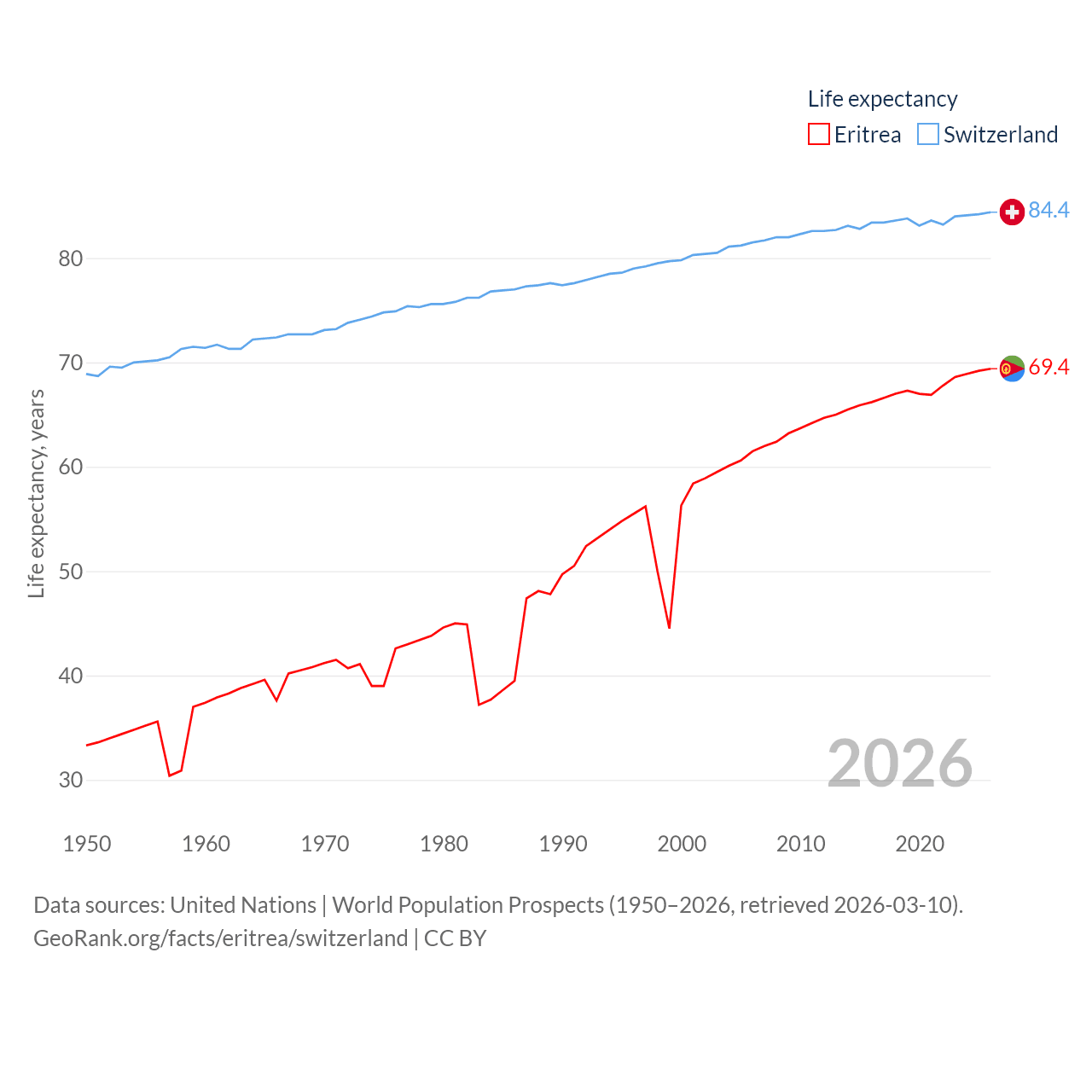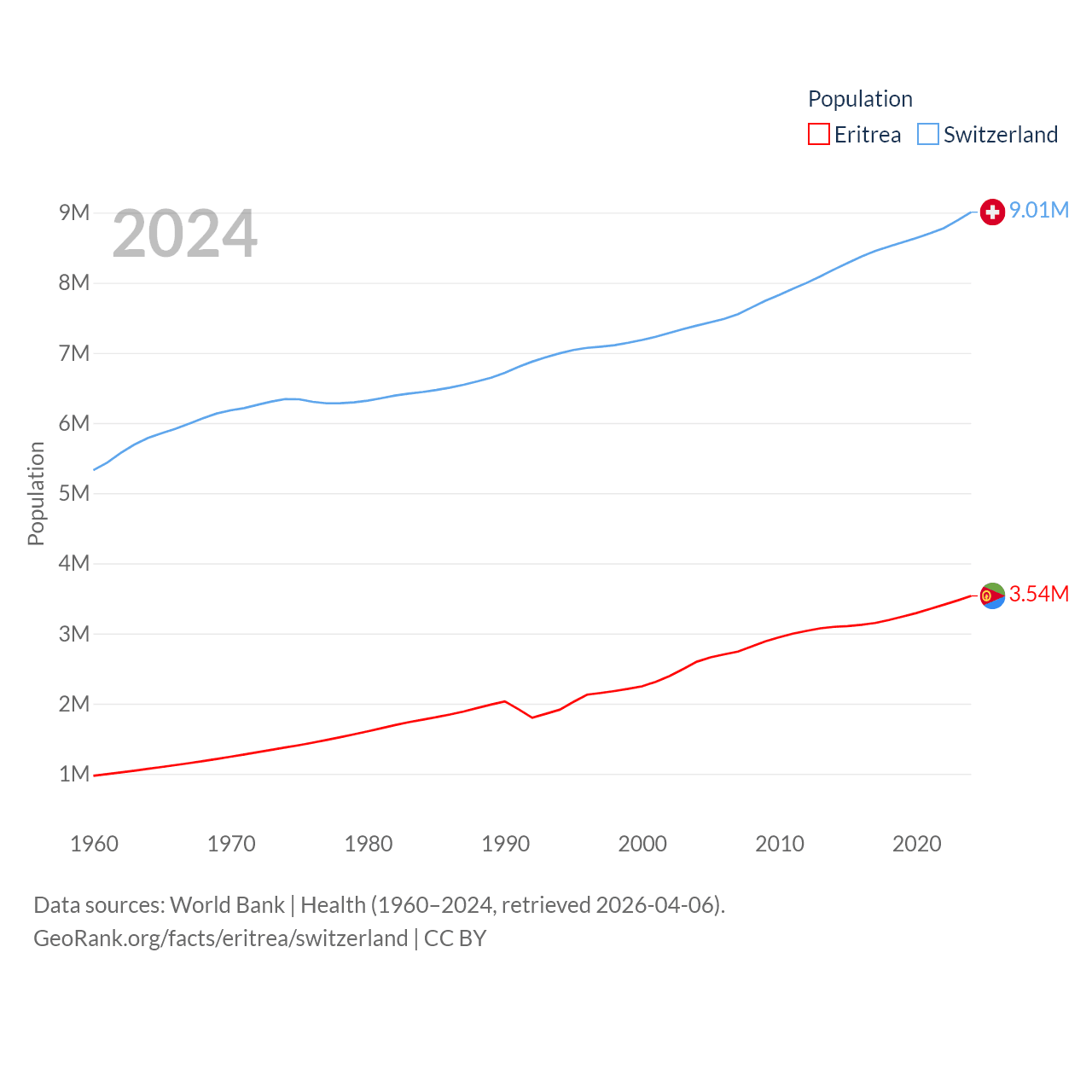 Eritrea has a population of 3.54M (ranked 131/197), compared with 9.01M in Switzerland (ranked 101/197). Eritrea's land area is 46,787 sq mi versus 15,255 sq mi for Switzerland (ranked 96th vs. 131st).