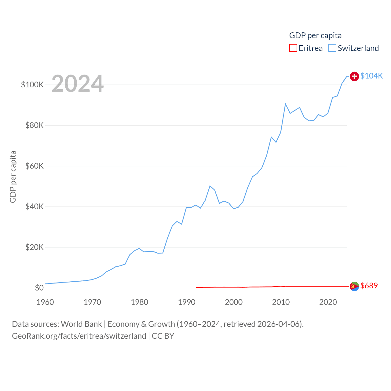 By GDP, Eritrea ranks 179/197 ($2.07B) and Switzerland ranks 20/197 ($937B). By GDP per capita, Eritrea ranks 188/197 ($689), while Switzerland ranks 5/197 ($103,998).