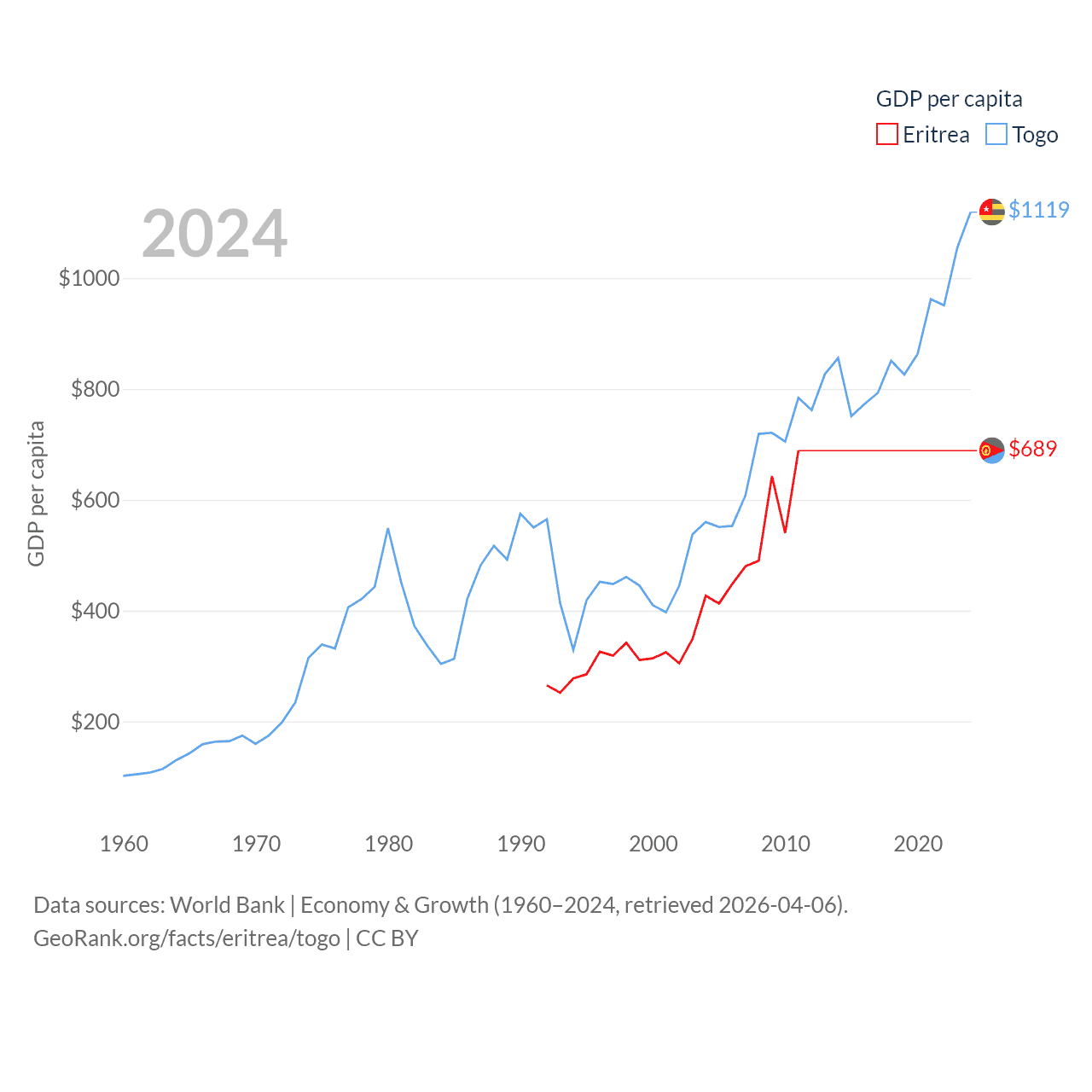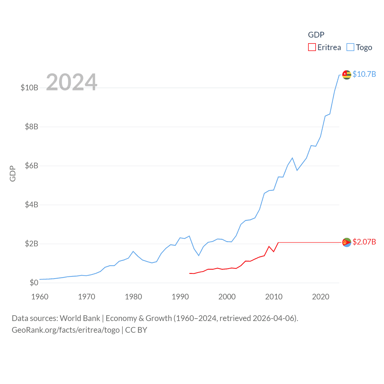 By GDP, Eritrea ranks 179/197 ($2.07B) and Togo ranks 154/197 ($10.7B). By GDP per capita, Eritrea ranks 188/197 ($689), while Togo ranks 172/197 ($1,119).