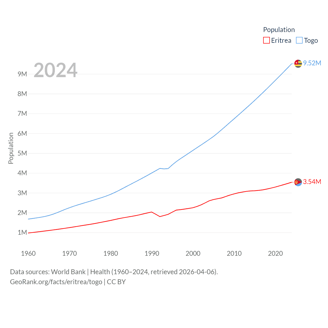Eritrea has a population of 3.54M (ranked 131/197), compared with 9.52M in Togo (ranked 98/197). Eritrea's land area is 46,787 sq mi versus 21,000 sq mi for Togo (ranked 96th vs. 124th).