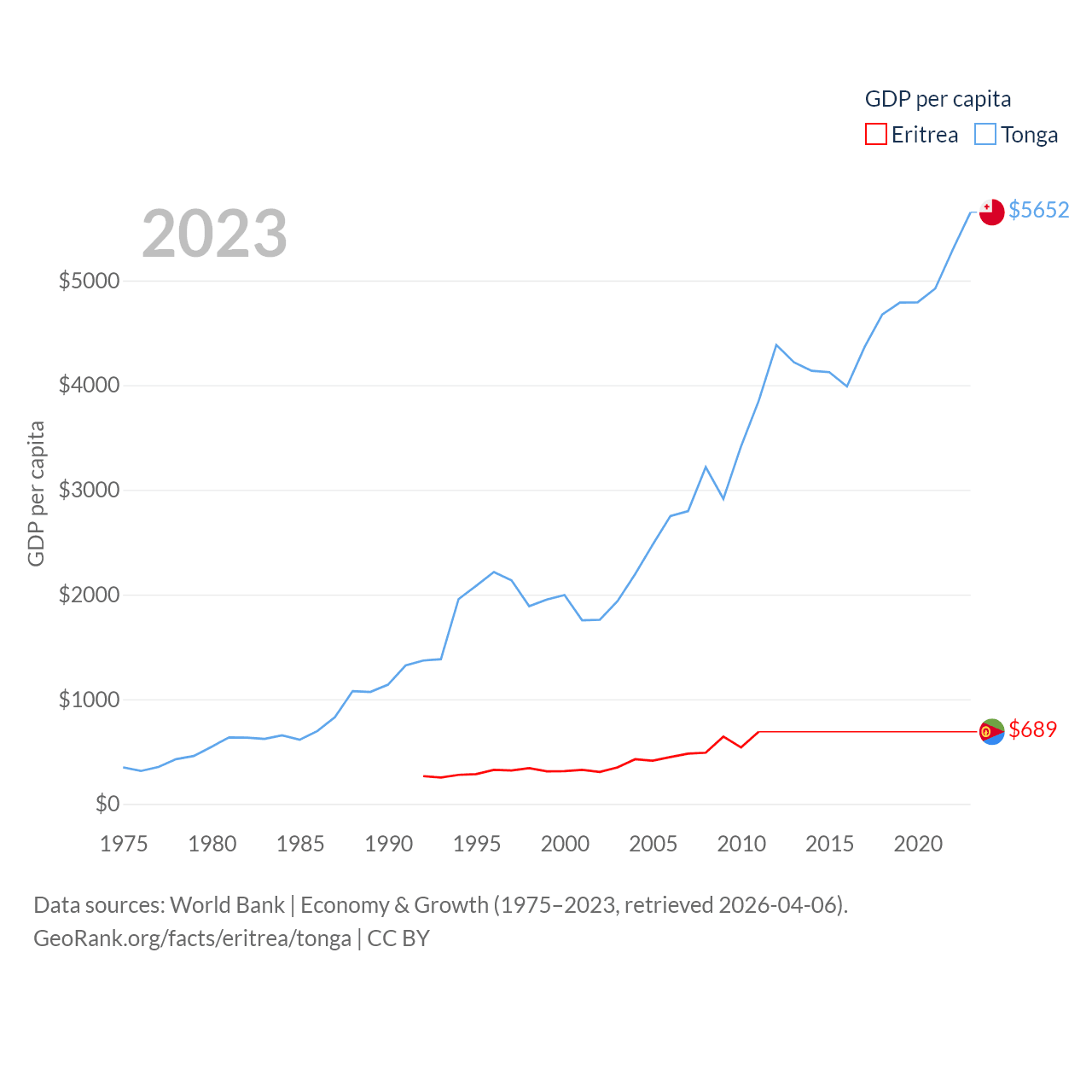 By GDP, Eritrea ranks 179/197 ($2.07B) and Tonga ranks 191/197 ($591M). By GDP per capita, Eritrea ranks 188/197 ($689), while Tonga ranks 115/197 ($5,652).