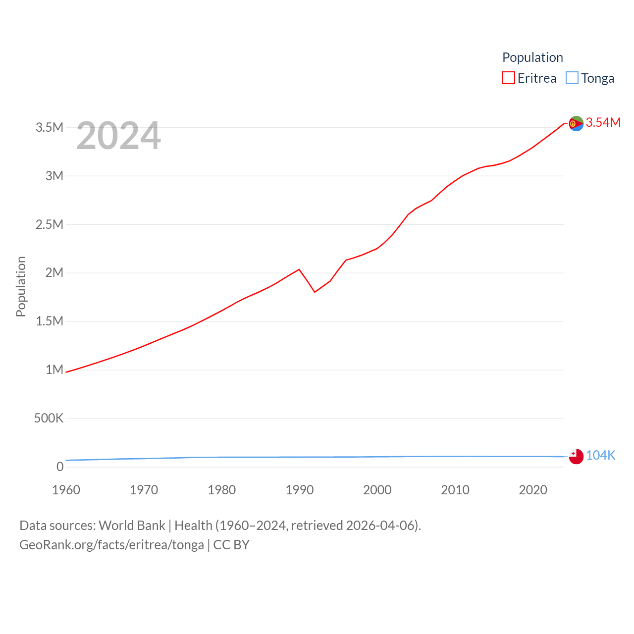 Eritrea has a population of 3.54M (ranked 131/197), compared with 104K in Tonga (ranked 183/197). Eritrea's land area is 46,787 sq mi versus 278 sq mi for Tonga (ranked 96th vs. 176th).