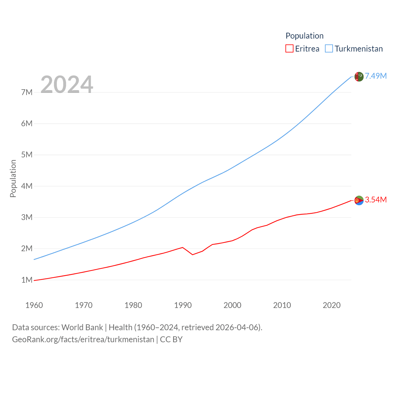 Eritrea has a population of 3.54M (ranked 131/197), compared with 7.49M in Turkmenistan (ranked 104/197). Eritrea's land area is 46,787 sq mi versus 181,441 sq mi for Turkmenistan (ranked 96th vs. 53rd).