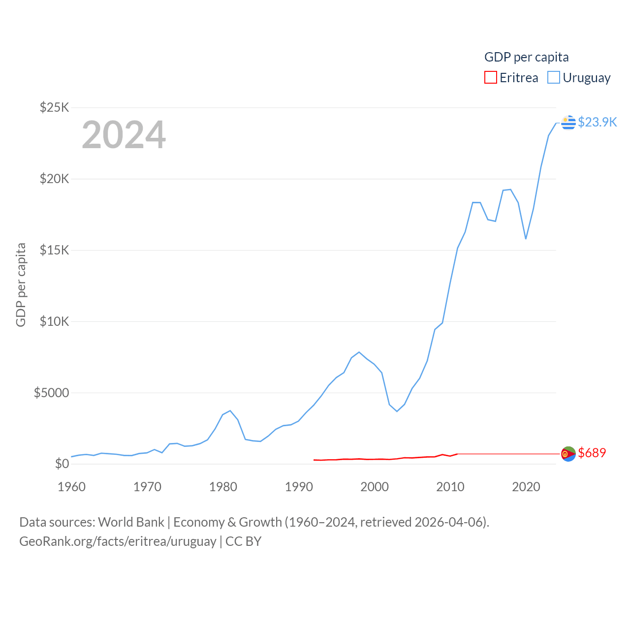 By GDP, Eritrea ranks 179/197 ($2.07B) and Uruguay ranks 81/197 ($81B). By GDP per capita, Eritrea ranks 188/197 ($689), while Uruguay ranks 52/197 ($23,907).
