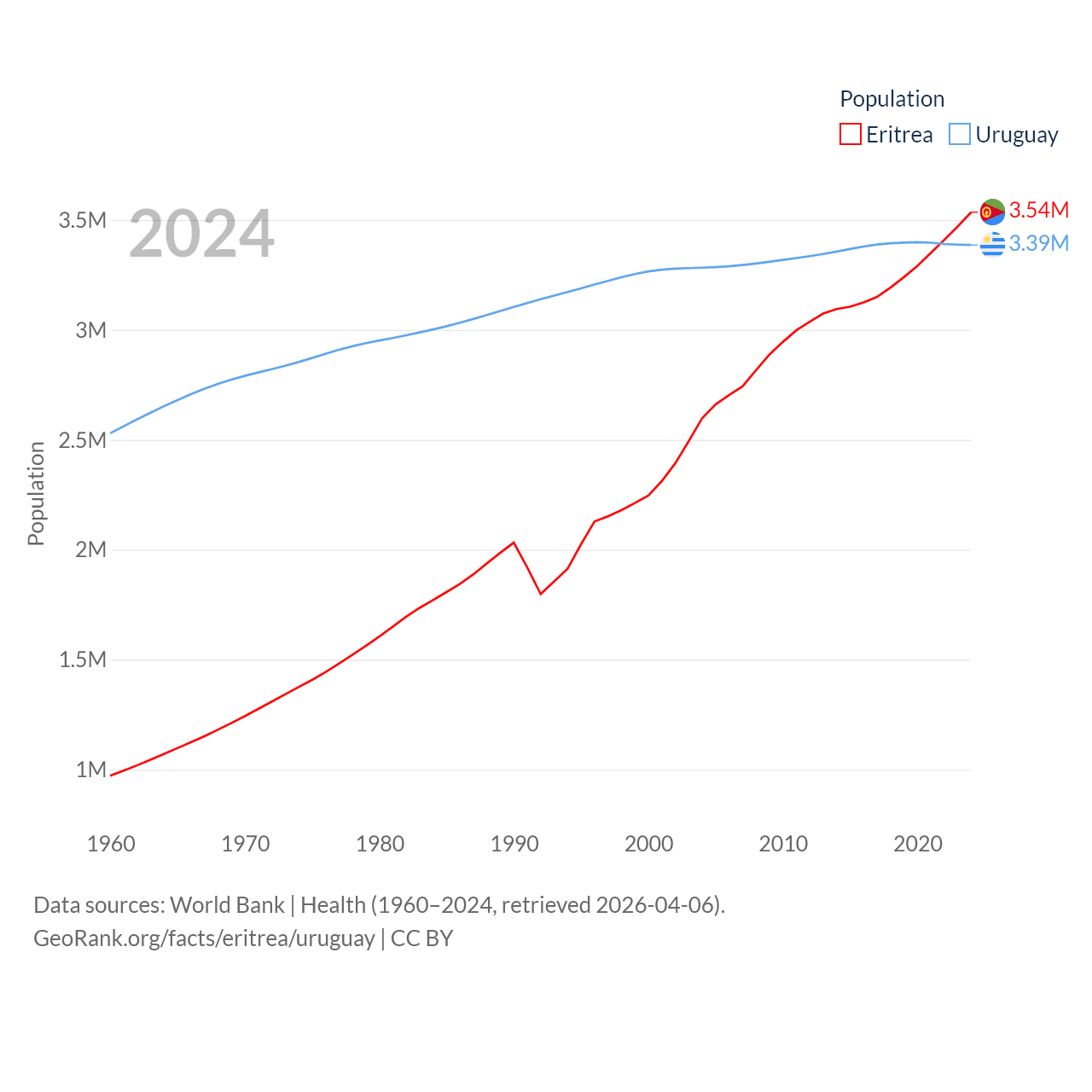 Eritrea has a population of 3.54M (ranked 131/197), compared with 3.39M in Uruguay (ranked 133/197). Eritrea's land area is 46,787 sq mi versus 67,576 sq mi for Uruguay (ranked 96th vs. 89th).