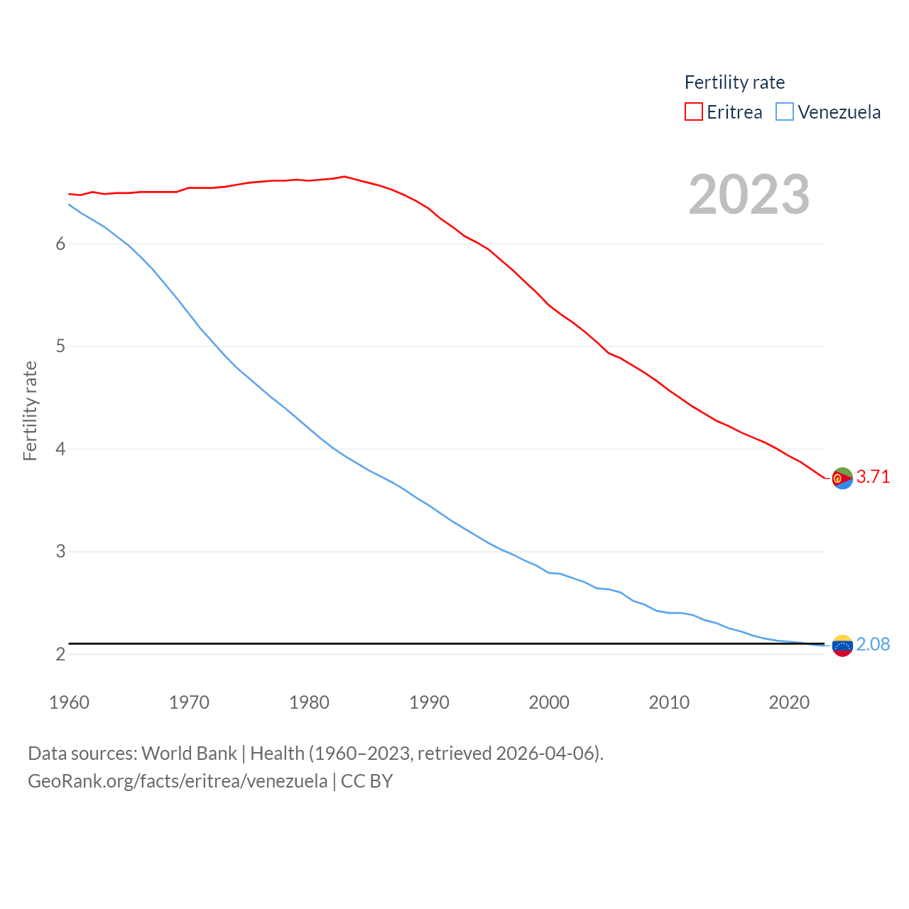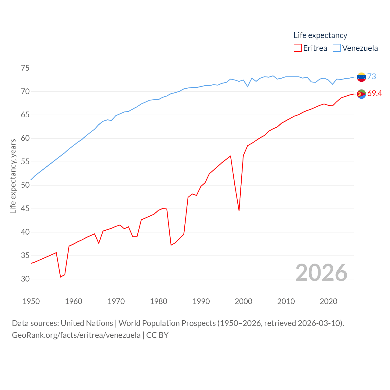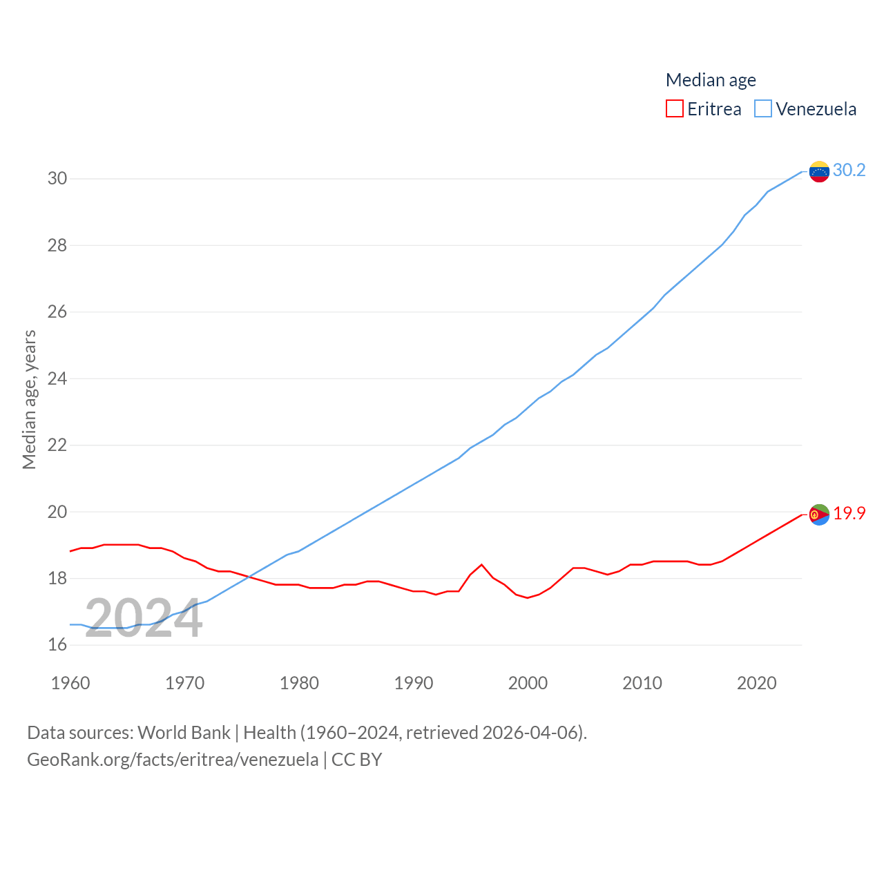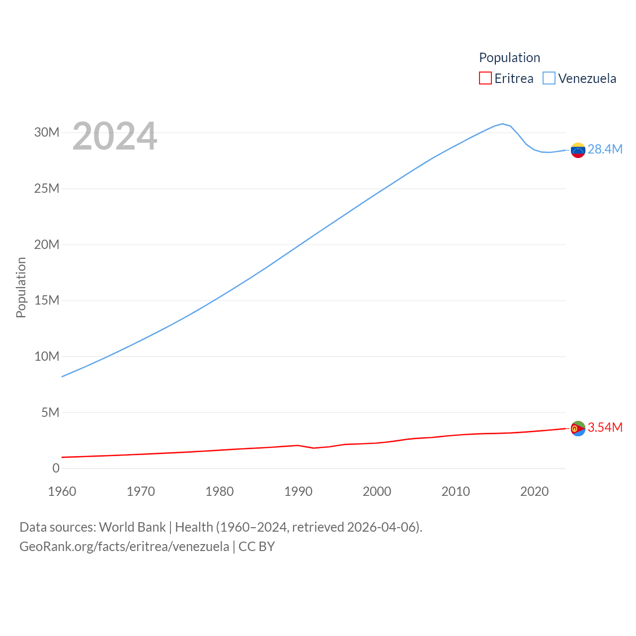 Eritrea has a population of 3.54M (ranked 131/197), compared with 28.4M in Venezuela (ranked 53/197). Eritrea's land area is 46,787 sq mi versus 340,561 sq mi for Venezuela (ranked 96th vs. 32nd).