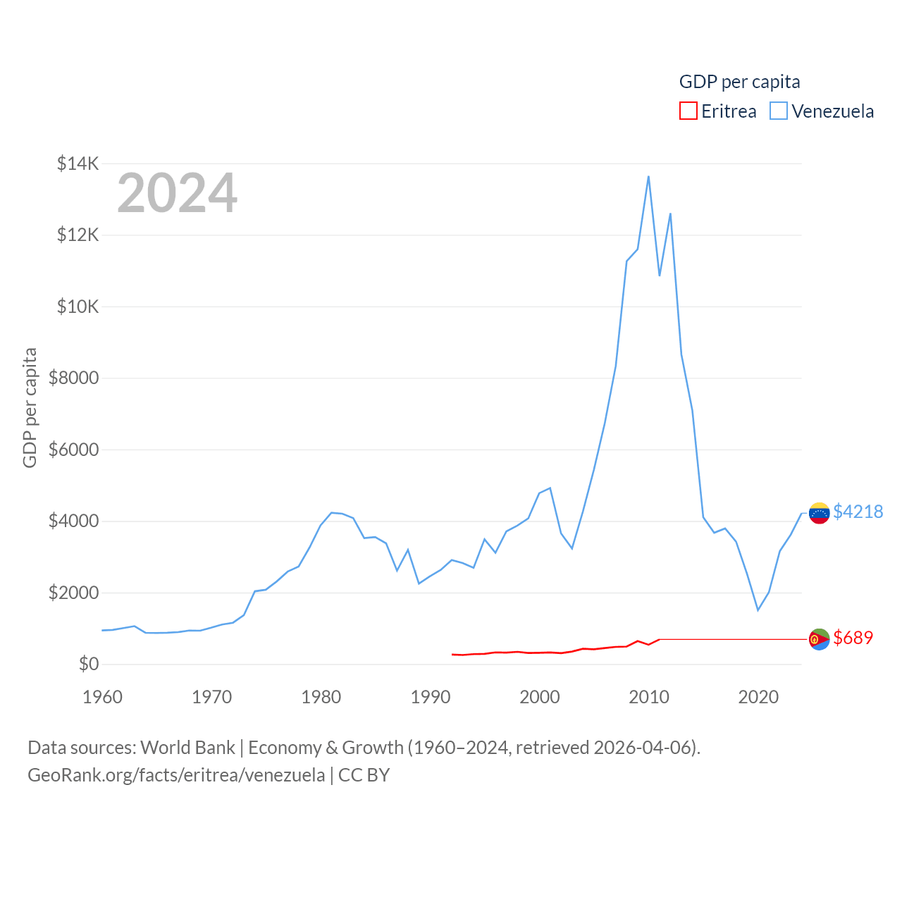 By GDP, Eritrea ranks 179/197 ($2.07B) and Venezuela ranks 65/197 ($120B). By GDP per capita, Eritrea ranks 188/197 ($689), while Venezuela ranks 128/197 ($4,218).