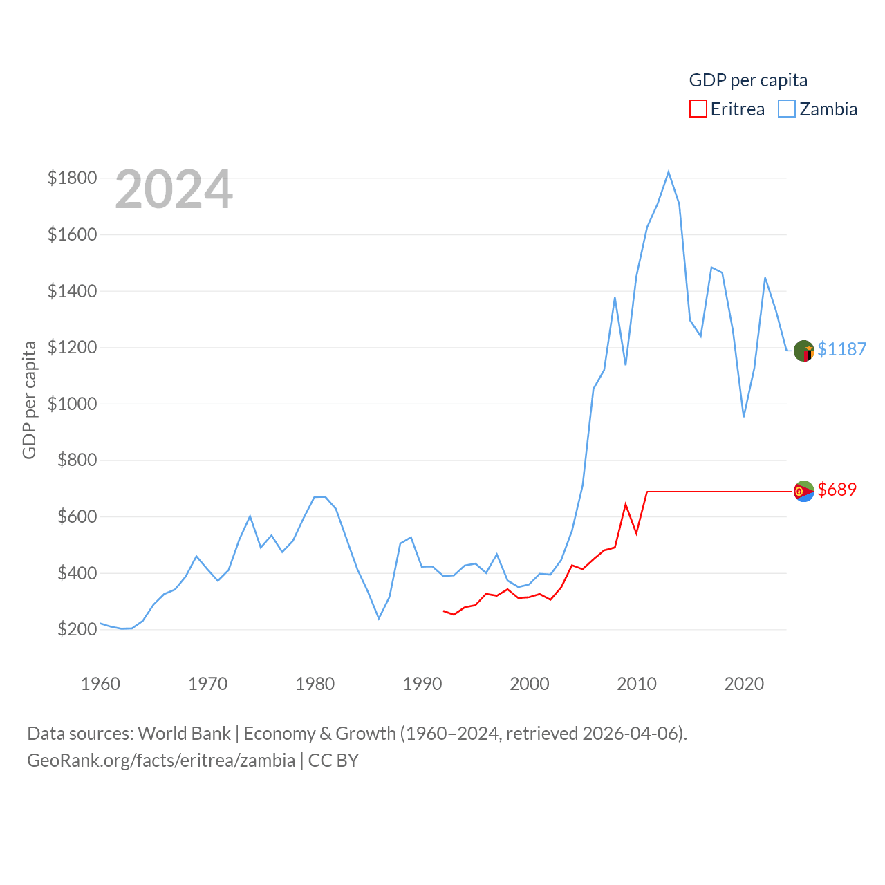 By GDP, Eritrea ranks 179/197 ($2.07B) and Zambia ranks 116/197 ($25.3B). By GDP per capita, Eritrea ranks 188/197 ($689), while Zambia ranks 169/197 ($1,187).