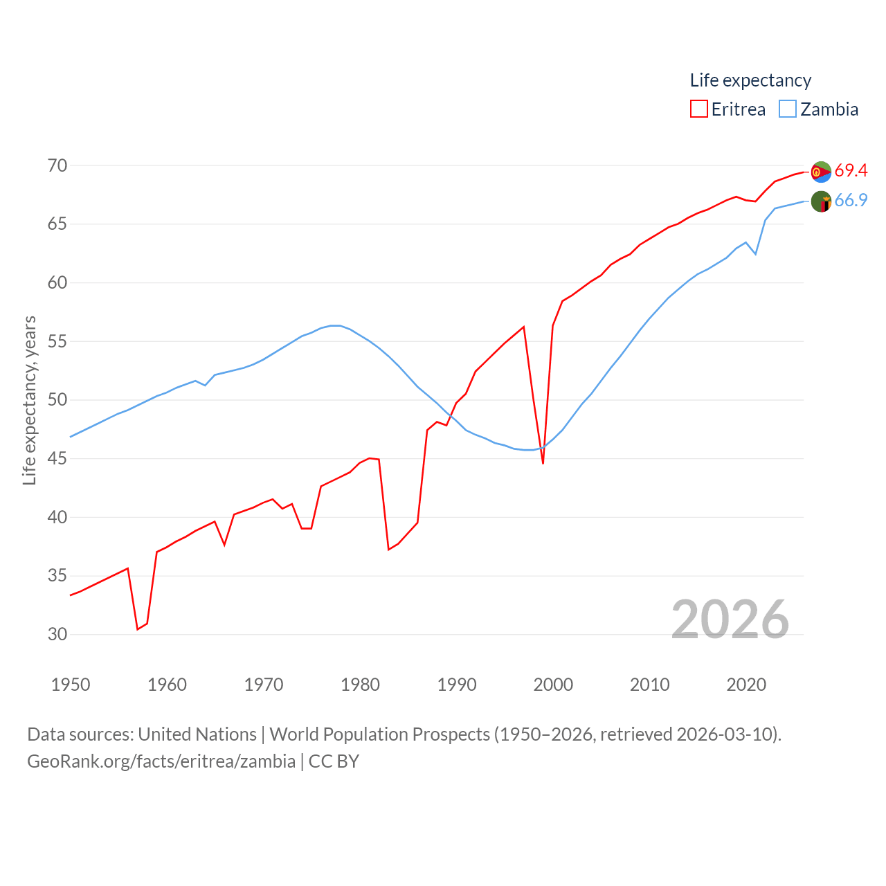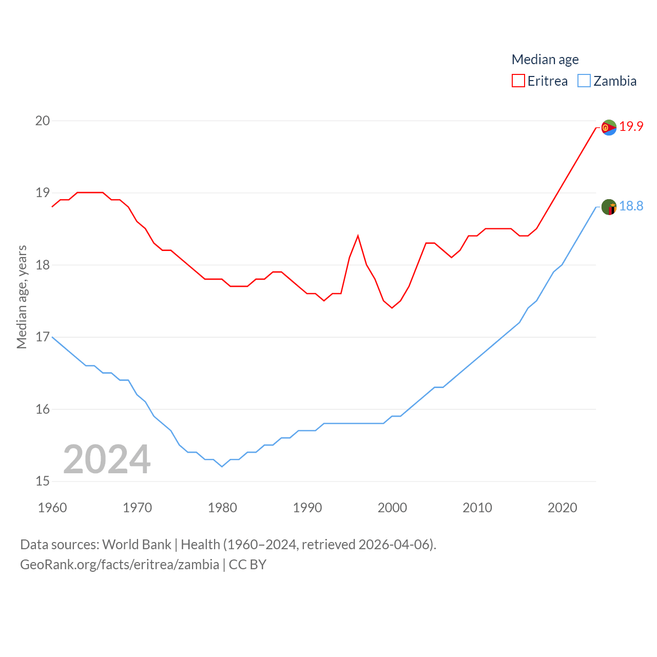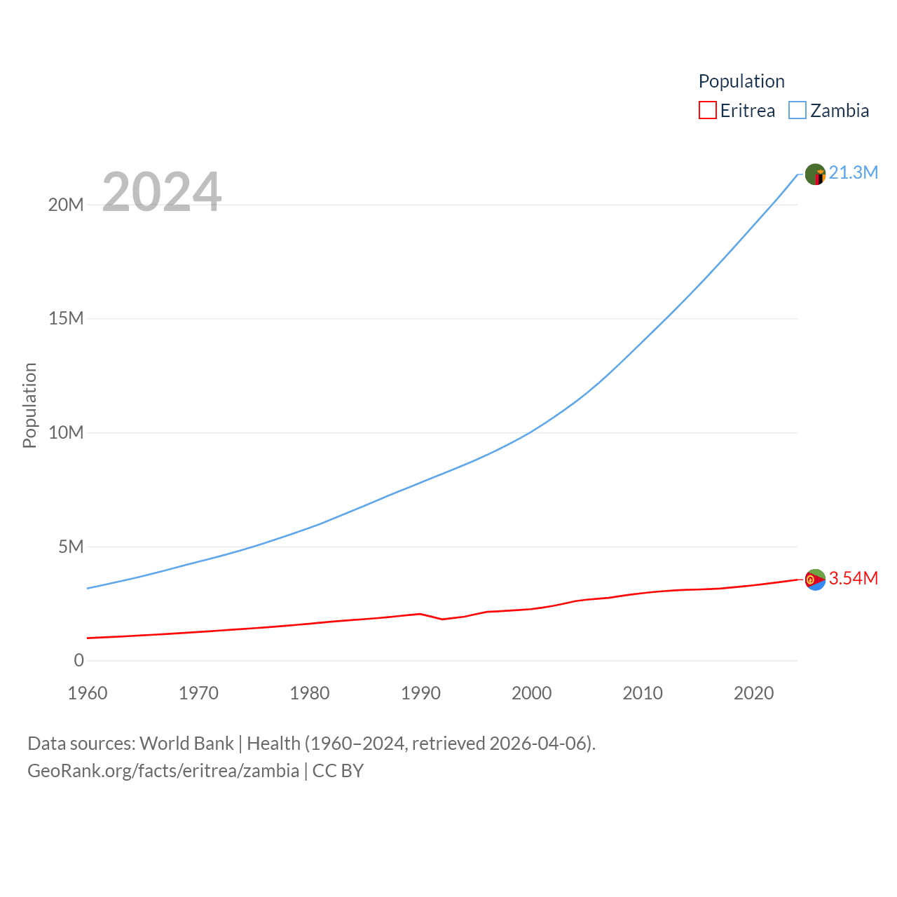 Eritrea has a population of 3.54M (ranked 131/197), compared with 21.3M in Zambia (ranked 63/197). Eritrea's land area is 46,787 sq mi versus 287,024 sq mi for Zambia (ranked 96th vs. 37th).