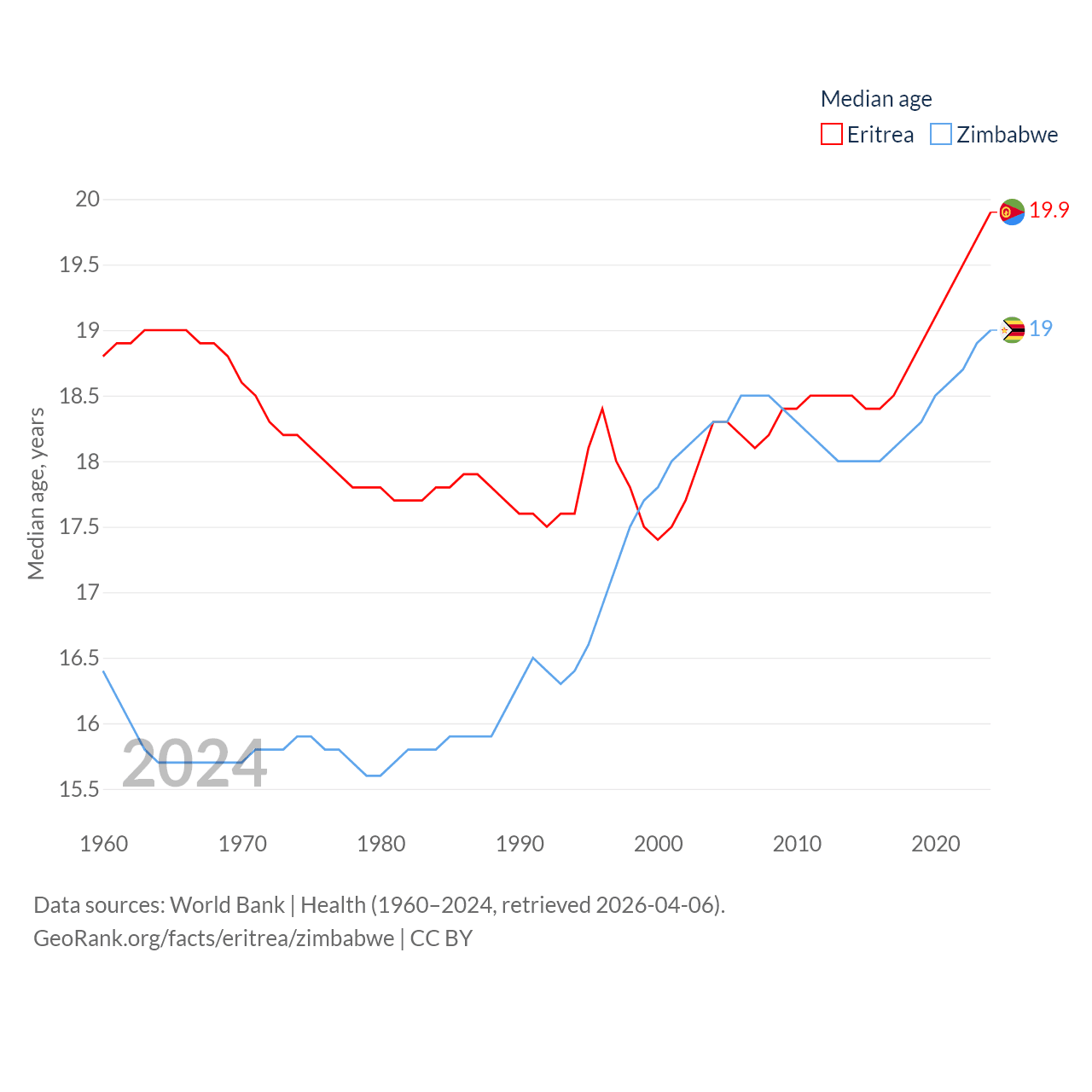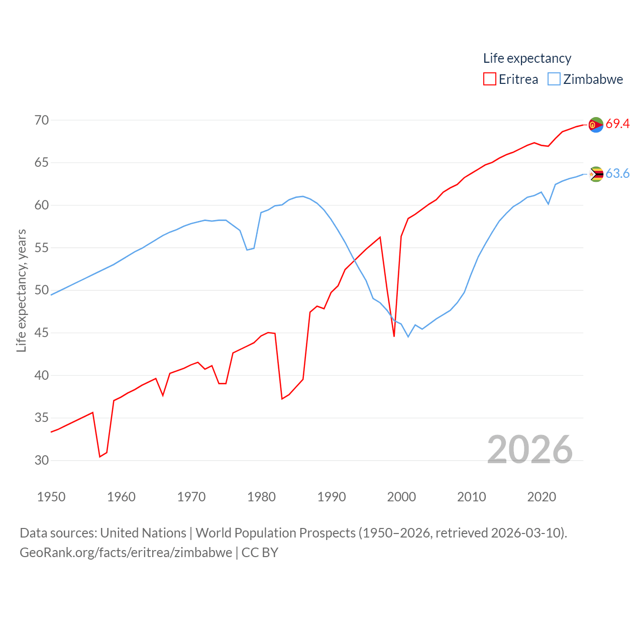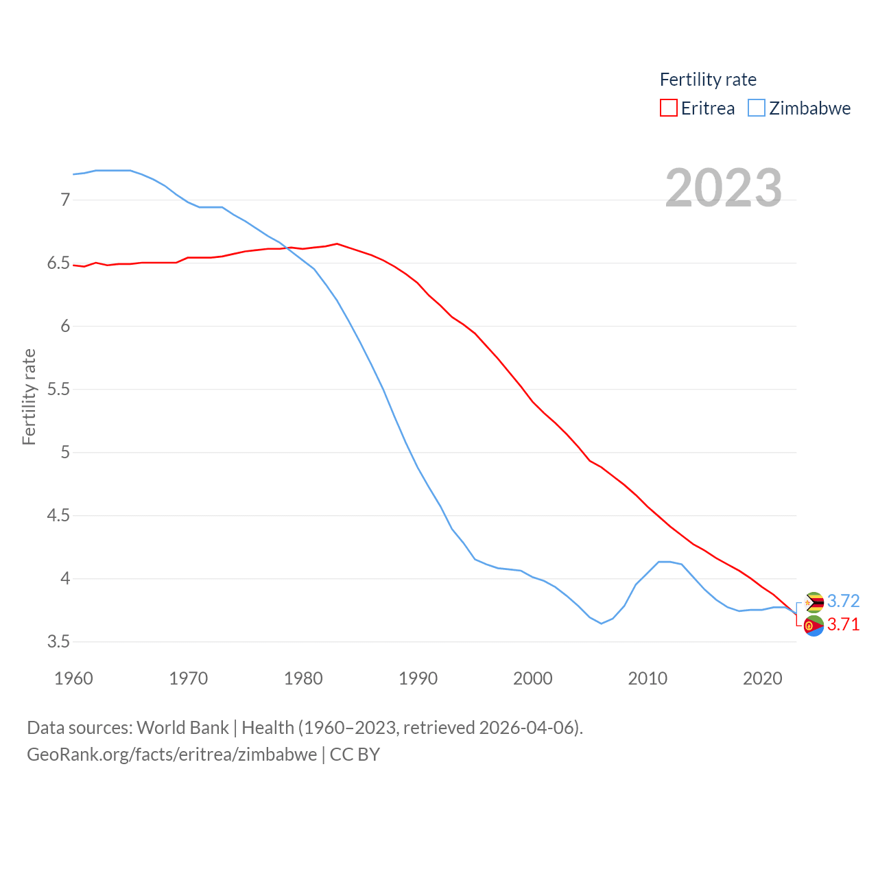 Eritrea has a population of 3.54M (ranked 131/197), compared with 16.6M in Zimbabwe (ranked 74/197). Eritrea's land area is 46,787 sq mi versus 149,364 sq mi for Zimbabwe (ranked 96th vs. 60th).