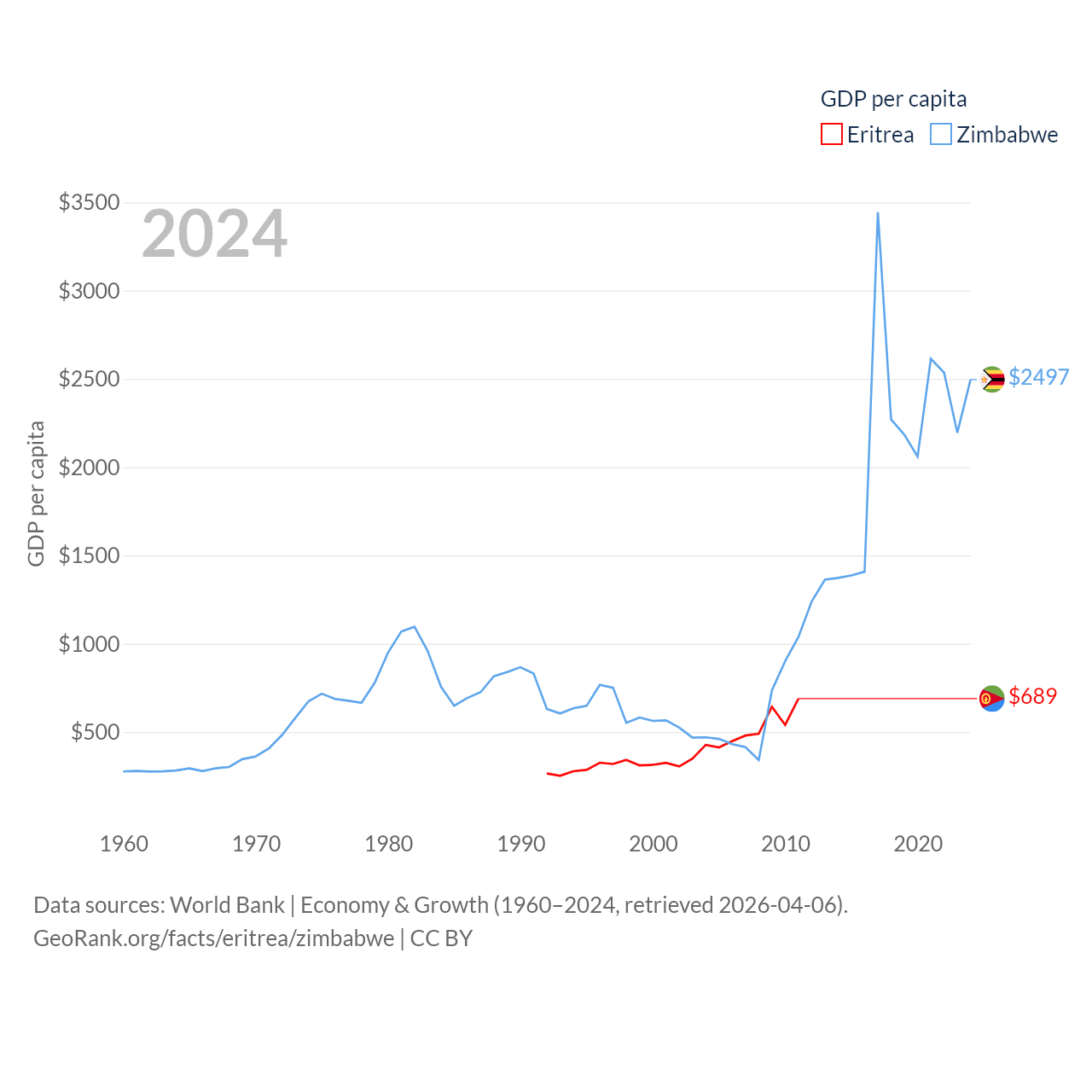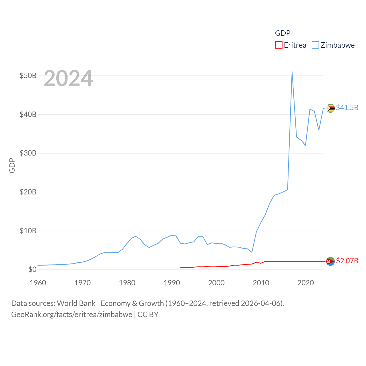By GDP, Eritrea ranks 179/197 ($2.07B) and Zimbabwe ranks 102/197 ($41.5B). By GDP per capita, Eritrea ranks 188/197 ($689), while Zimbabwe ranks 148/197 ($2,497).