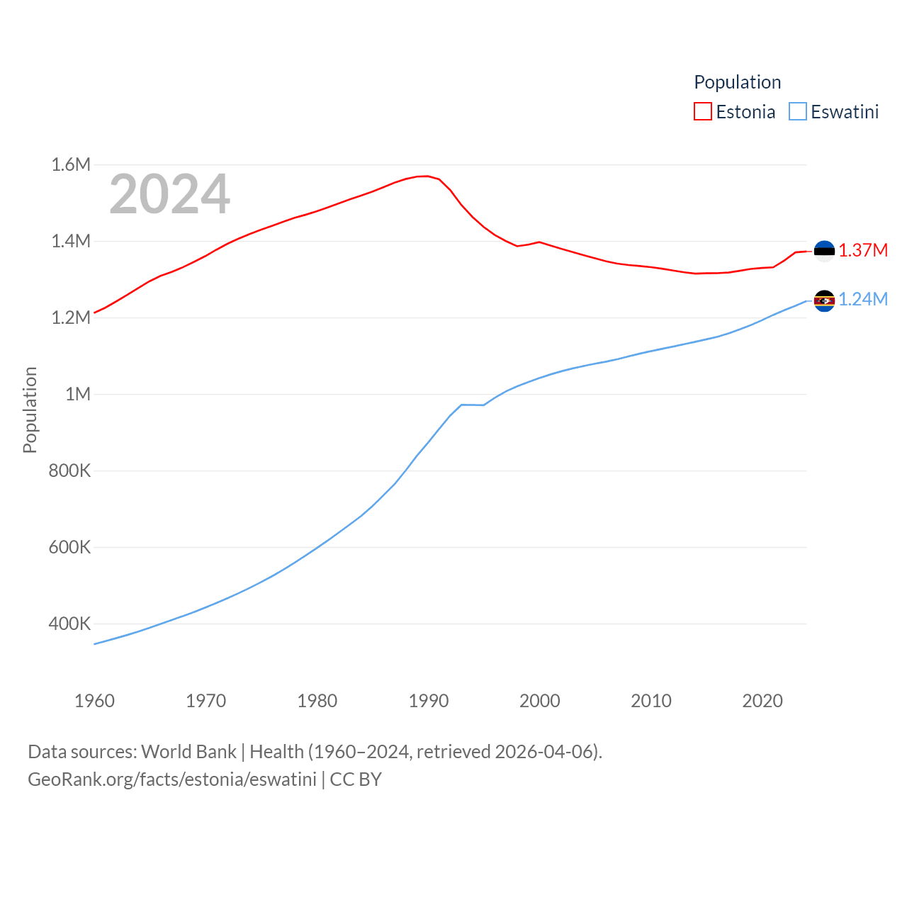 Estonia has a population of 1.37M (ranked 153/197), compared with 1.24M in Eswatini (ranked 157/197). Estonia's land area is 16,498 sq mi versus 6,641 sq mi for Eswatini (ranked 129th vs. 154th).