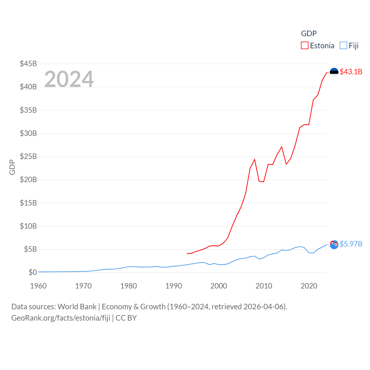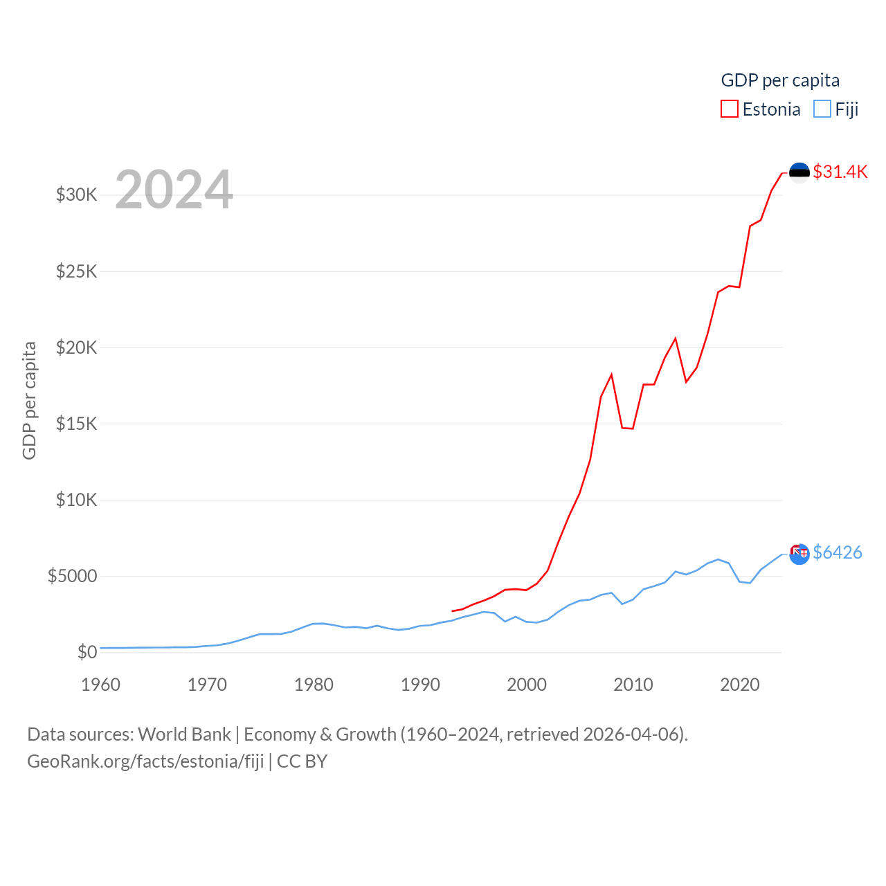 By GDP, Estonia ranks 100/197 ($43.1B) and Fiji ranks 161/197 ($5.97B). By GDP per capita, Estonia ranks 40/197 ($31,428), while Fiji ranks 108/197 ($6,426).