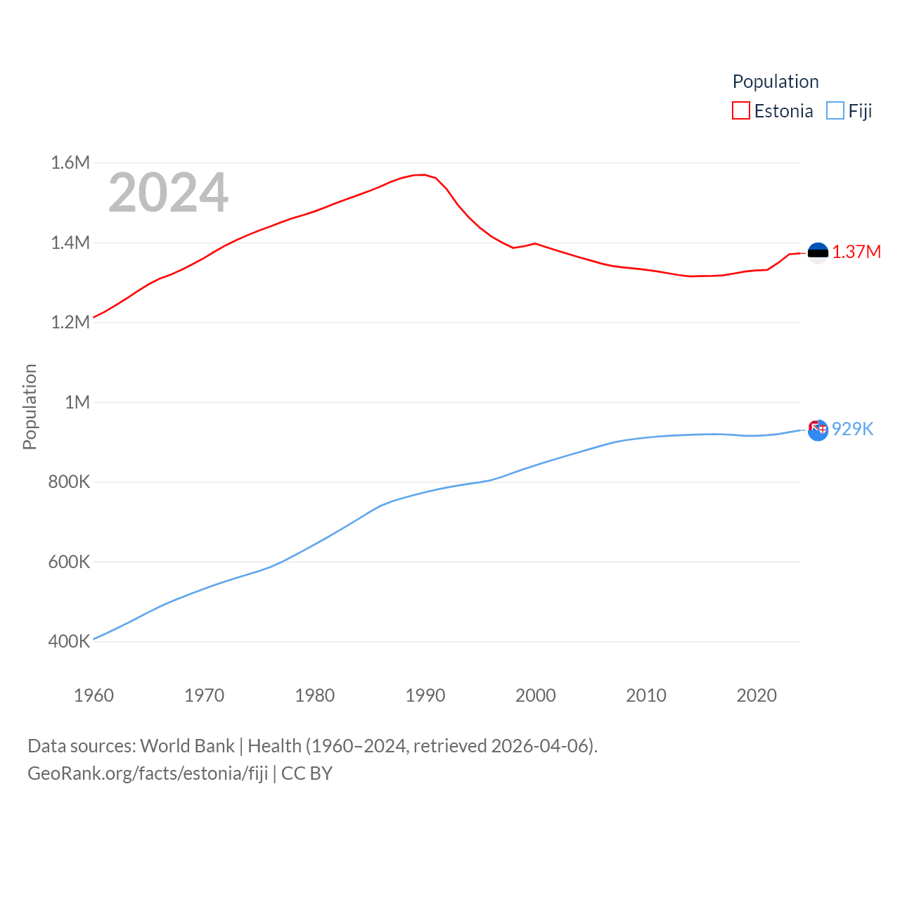 Estonia has a population of 1.37M (ranked 153/197), compared with 929K in Fiji (ranked 159/197). Estonia's land area is 16,498 sq mi versus 7,054 sq mi for Fiji (ranked 129th vs. 152nd).